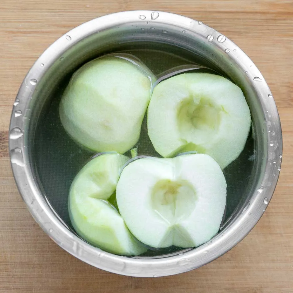 - Наливаем в отдельную миску воду, и выдавливаем половину лимона — туда мы будем чистить яблоки, и складывать порезанные, чтобы они не потемнели на воздухе. Это первая возможная причина темной начинки.
