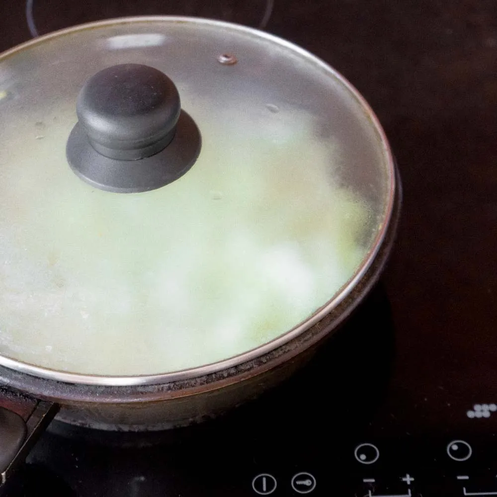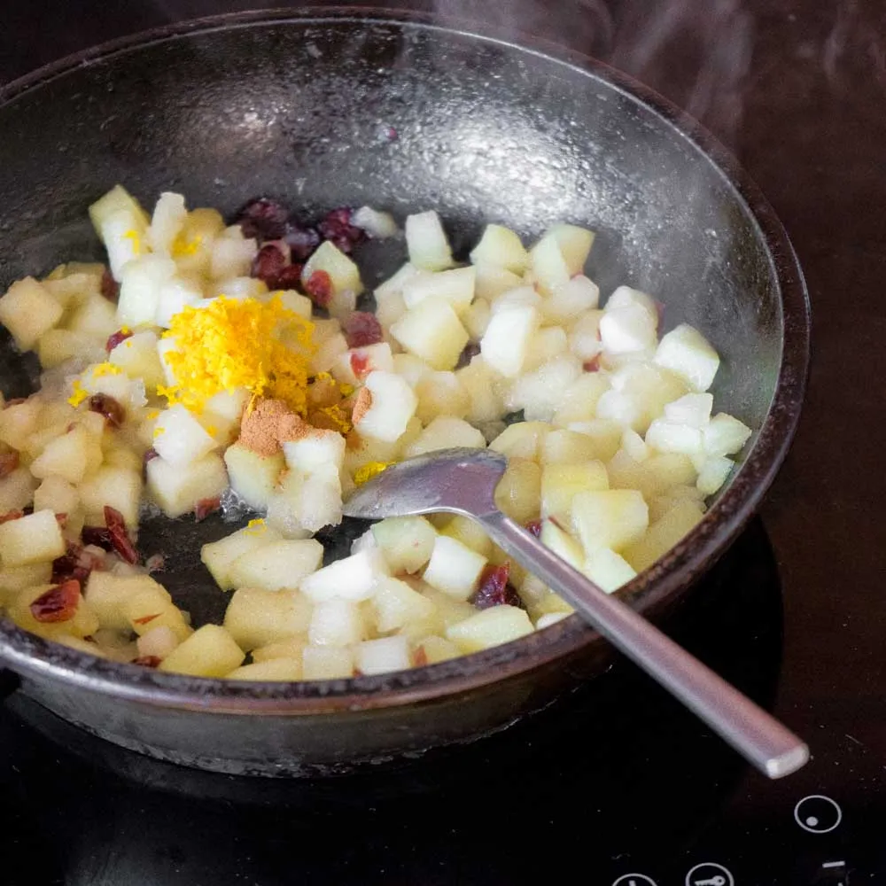 Накрываем крышкой, и тушим на медленном огне ∼5 минут, пока яблоки чуть-чуть не размякнут.