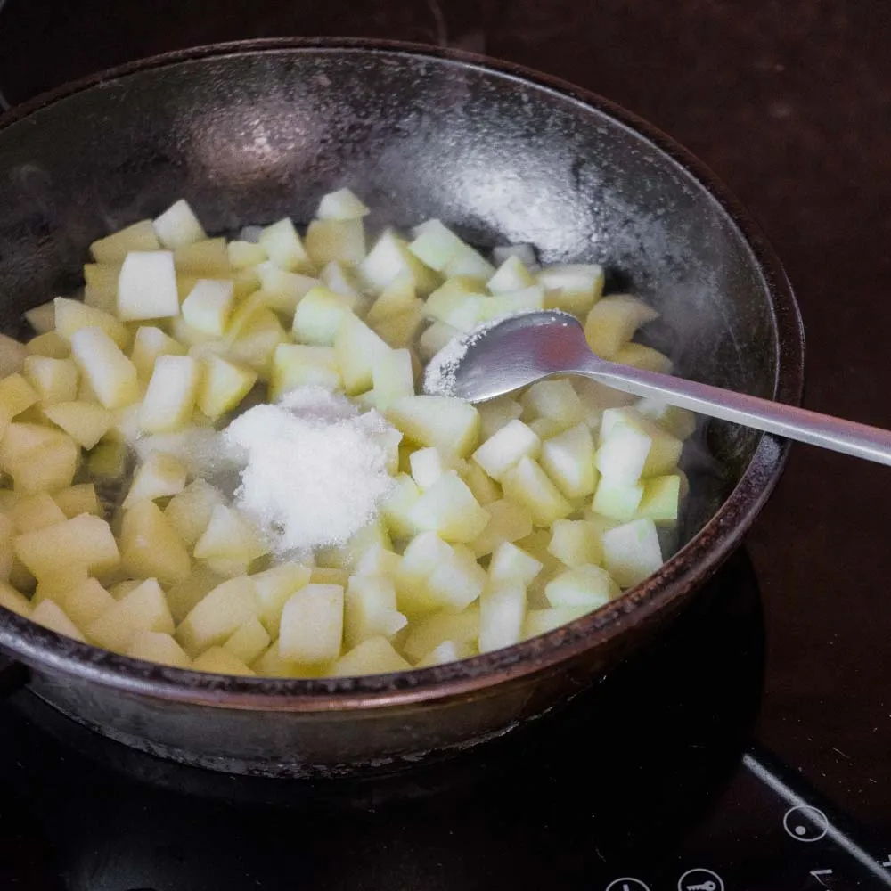 Сейчас из-за сахара яблоки станут активно выделять сок, и наша задача — по-быстрому выпарить жидкость.