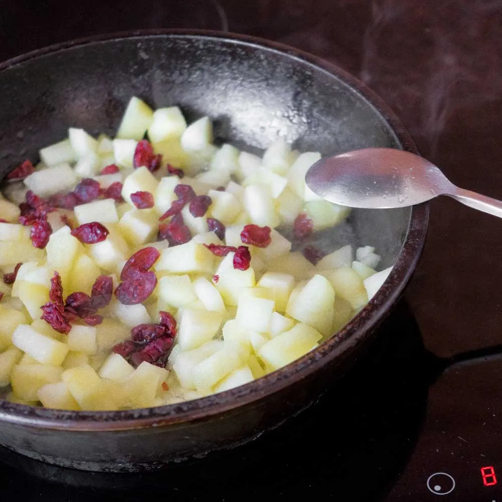 - Снимаем крышку, добавляем сахар (35гр), и сушеную клюкву (25гр), хорошенько перемешиваем. Если яблоки совсем вхлам кислые — можно добавить больше сахара, или меньше, если они сладкие.