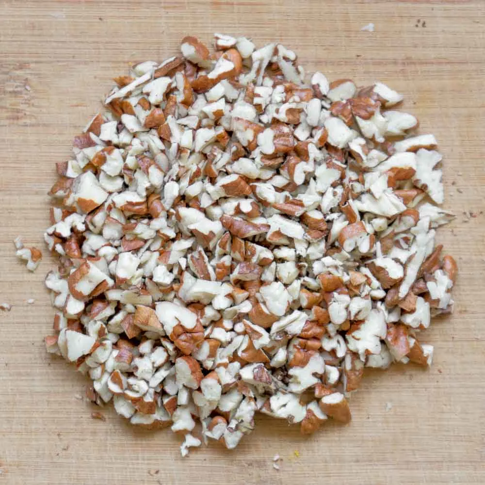 Пеканы (60 гр) порубим ножом в крошку ∼0.3 — 0.5 см — не надо сильно мельчить, и тем более, перемалывать в измельчителе — чем крупнее орешек, тем лучше он будет чувствоваться в общей массе вместе с начинкой. Сильно крупно тоже не надо, нам потом это заворачивать в рулет придется.