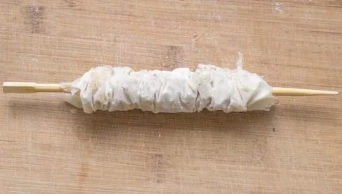 - Чтобы свернуть пахлаву, мы наматываем ее на палочку, и затем толкаем тесто с двух сторон к центру, как люля-кебаб: