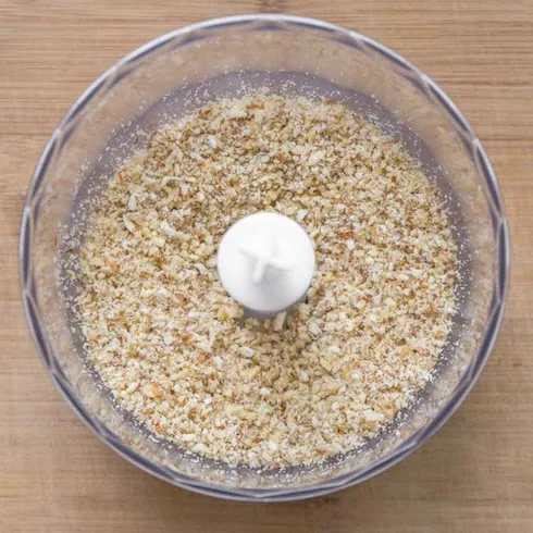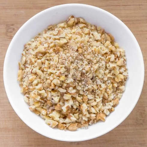 - Подготовим орешки — часть размелем измельчителем, часть порежем крупно ∼0.3-0.5 см. Можно не обжаривать — небольшие должны неплохо пропечься в духовке во время выпечки.