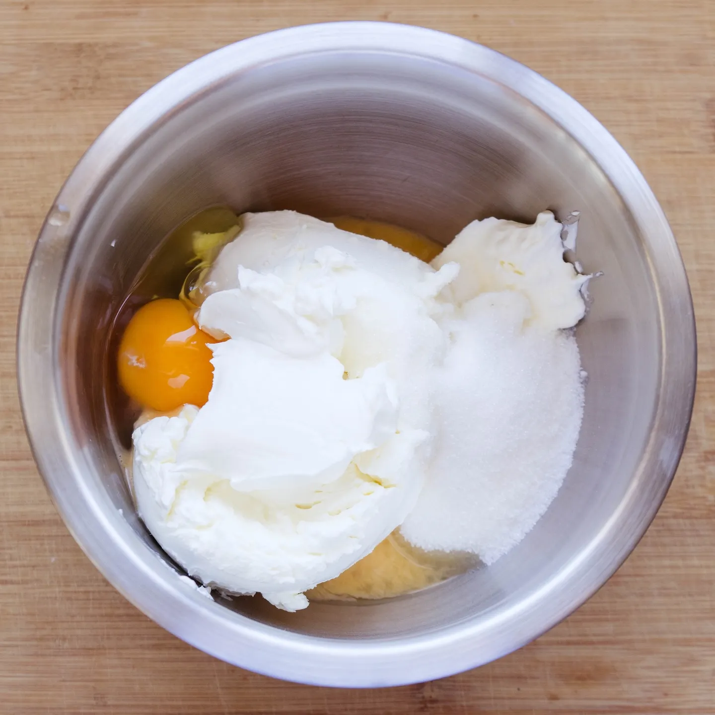Смешиваем сыр и сахар. Если объем сыра небольшой, то сразу же можно добавить яйца (взболтать вилкой белок с желтком, и отмерить нужный вес). Если готовишь на 18-20 и более см., то лучше вводить их по одному — так смесь лучше сохраняет однородность, и ее проще смешать.
