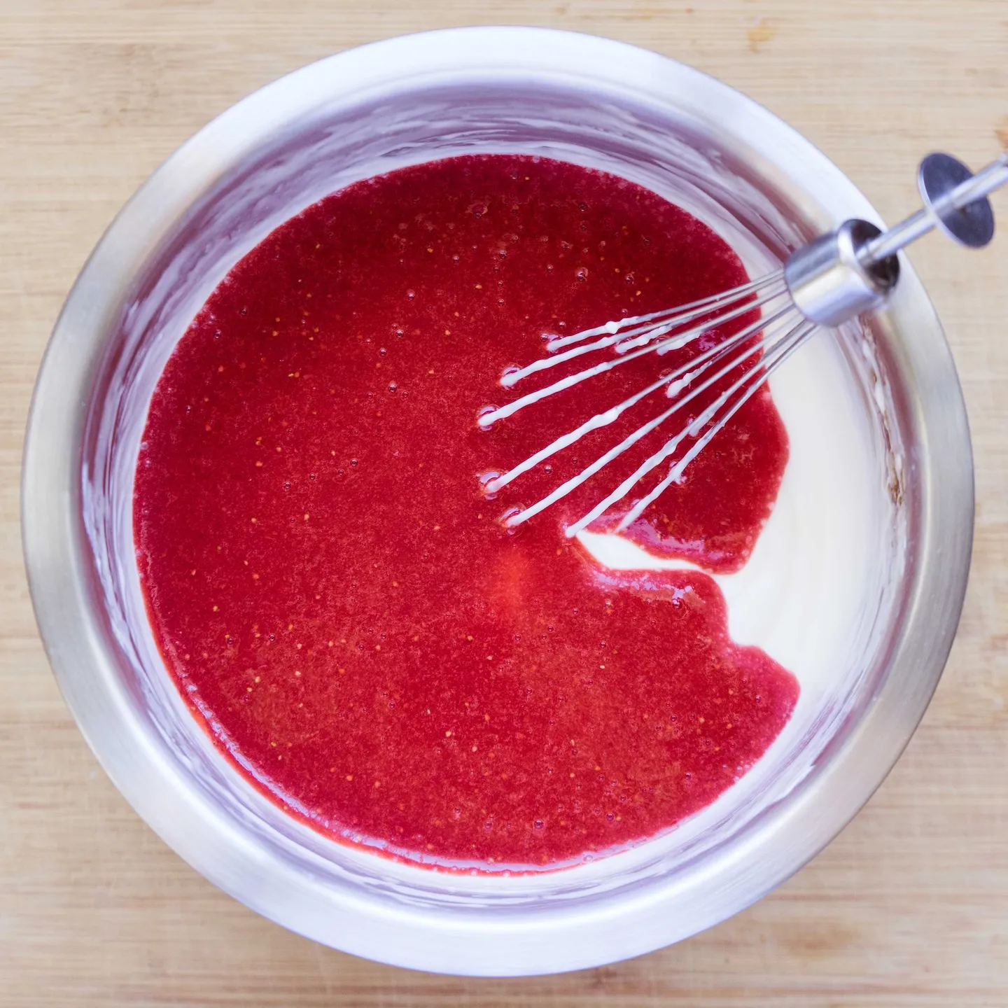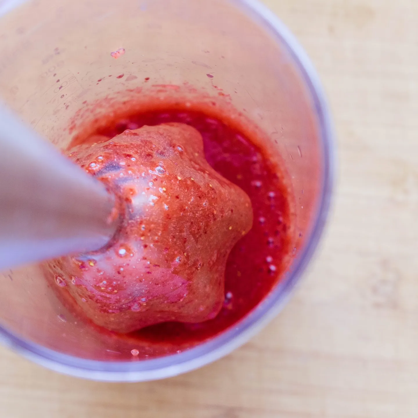 - Готовим пюре. Ягоды моем/размораживаем, пробиваем блендером. При необходимости добавляем сахар или провариваем с крахмалом. Нам нужно получить приятный вкус и консистенцию жидкой сметаны. Так же его можно протереть через сито, чтобы избавиться от косточек (малины, ежевики и т.д.), но смотри, чтобы итоговый вес жидкой части был как в рецепте, а не что останется)))