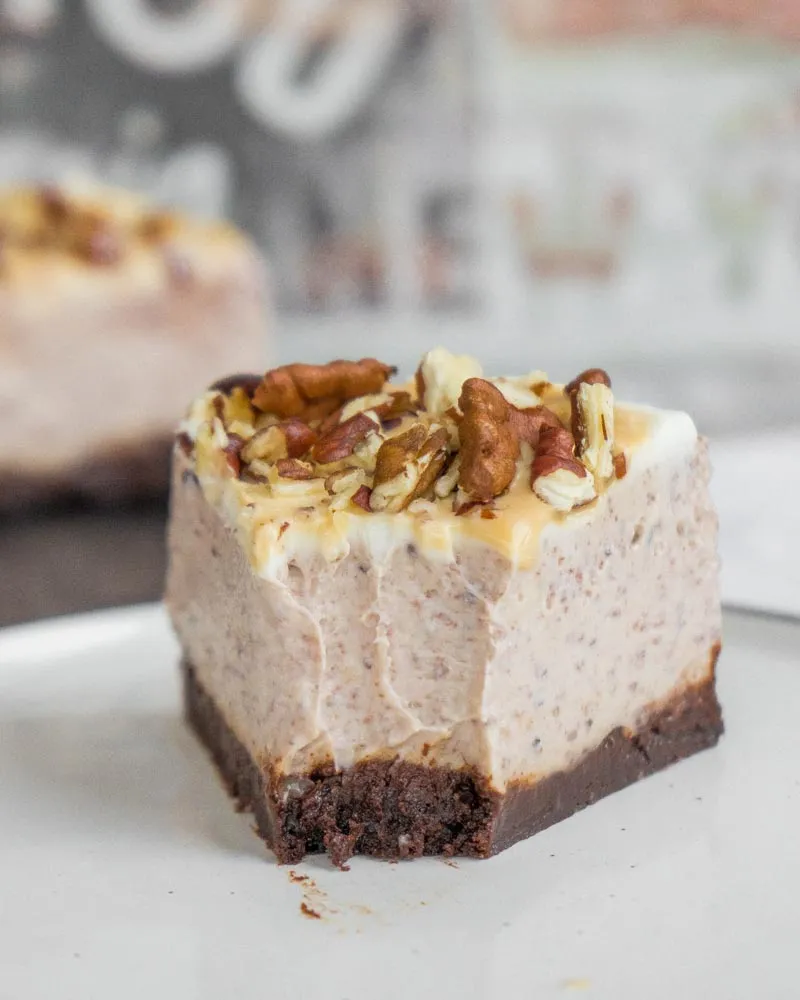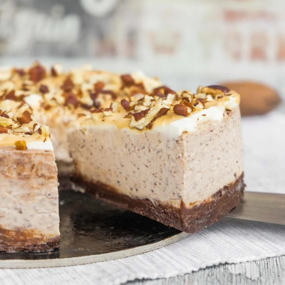 Перед подачей покрываем чизкейк сначала смесью сливочного сыра (70 гр.) и сахара (7 гр), затем — вареной сгущенкой (70 гр). Сверху посыпаем крупно рубленными пеканами.