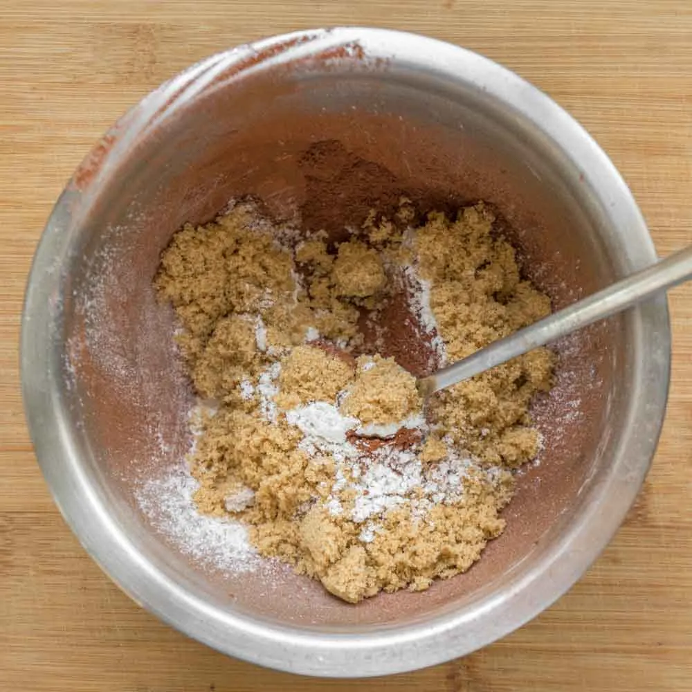 - В отдельную миску просеиваем какао (16 гр), муку (13 гр) и разрыхлитель (1/5 ч.л.), добавляем мелкий коричневый сахар (72 гр.) — если сахар крупный, лучше измельчи его в кофемолке, или измельчителе, иначе он будет хрустеть на зубах.