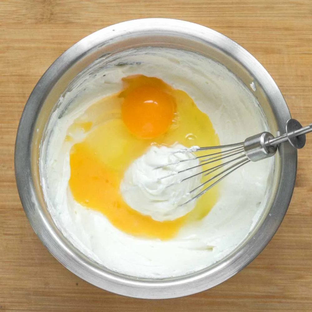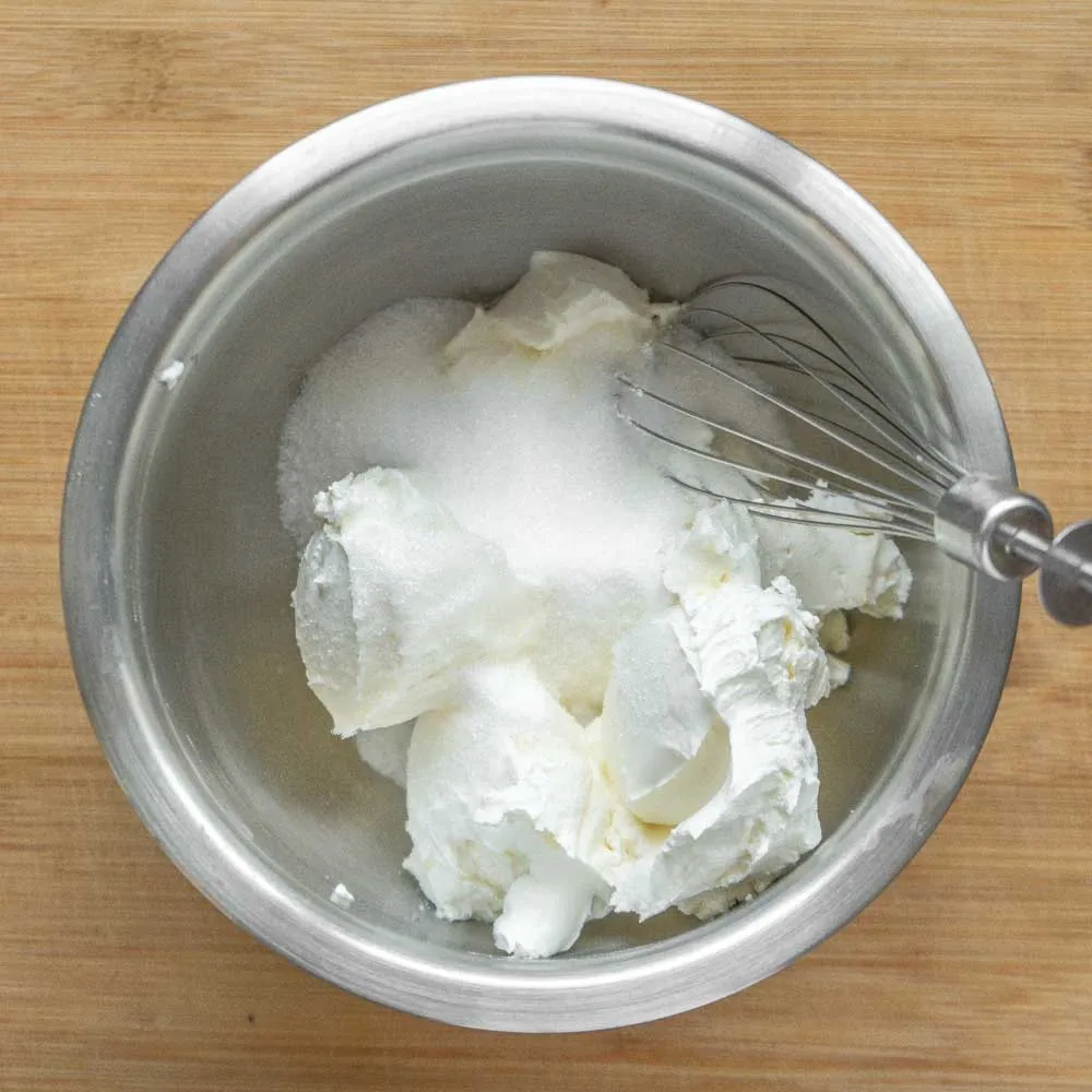 - В чистой миске смешиваем сливочный сыр (400 гр.) и сахар (75 гр) до однородности. Если делаешь это венчиком, то только вручную, чтобы не вбить в смесь пузыри воздуха, иначе чизкейк вздуется.