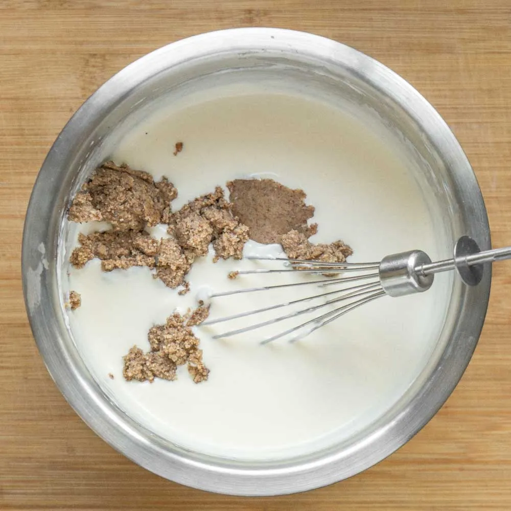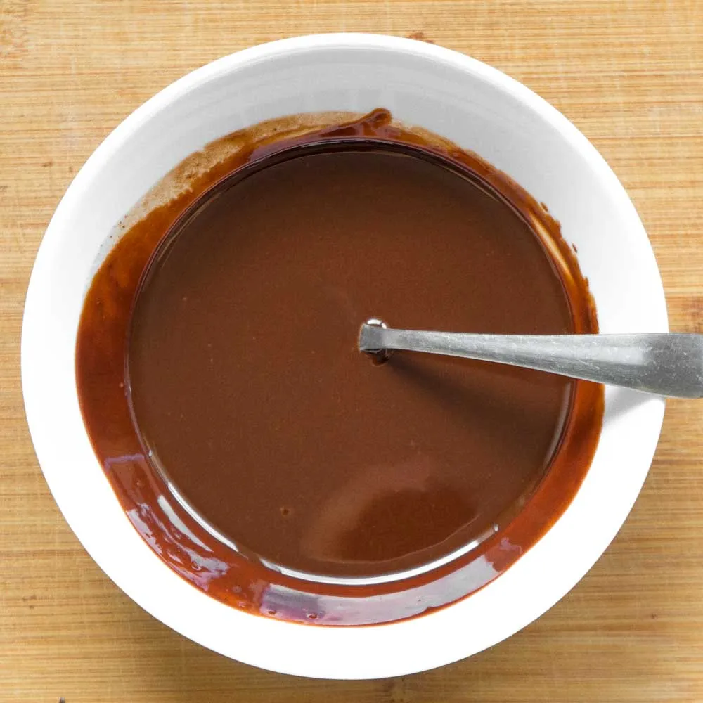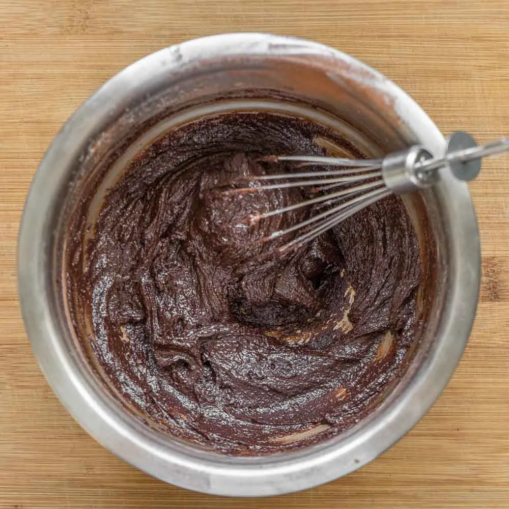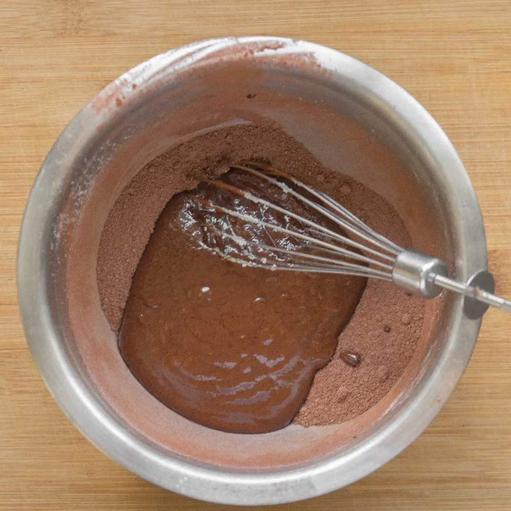 - В шоколад добавляем яйцо (45 гр.), и хорошенько размешиваем. Смесь начнет густеть. Затем эту смесь выливаем в сухие ингредиенты и хорошенько перемешиваем.