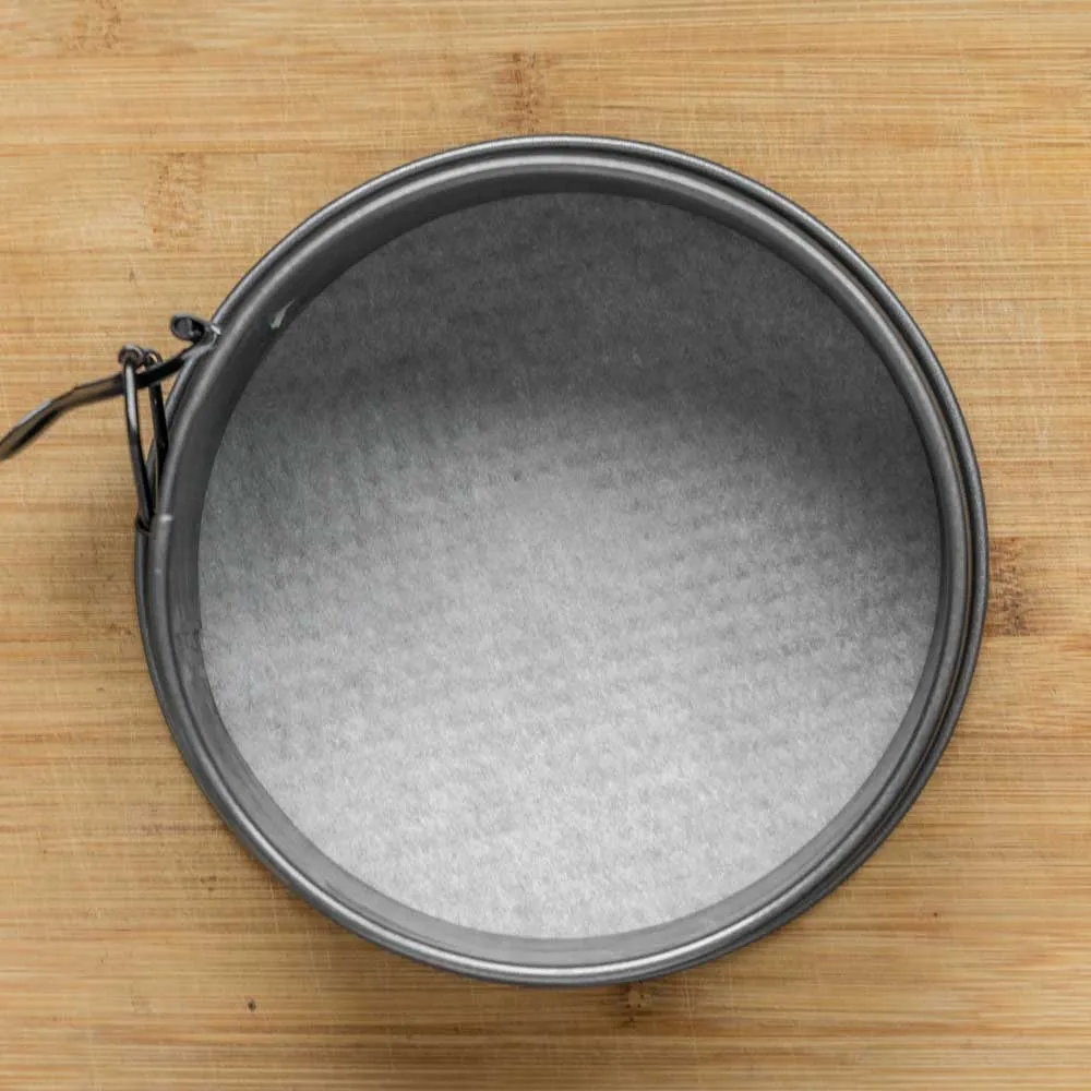 - Подготавливаем форму. Я использую обычную разъемную форму — ставлю ее донышком вверх (там идет неровность, за которую цепляется основа, и чиз потом трудно вытащить), смазываю маслом, и под низ кладу бумагу для выпечки.