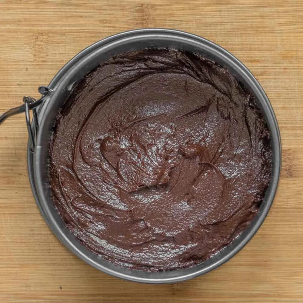 - Дальше — выкладываем брауни, разравниваем. Выливаем сырную начинку, и снова разравниваем.