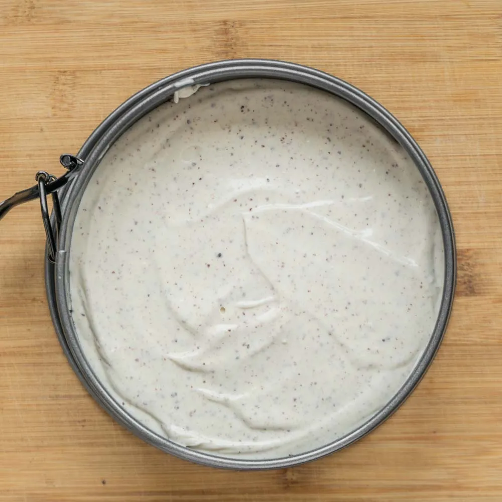 Выпекаем при 110-120°С около 90-120 минут — если есть желание, можно проверить температуру в центре чизкейка — она должна быть 71°С. Но обычно ждем, когда края схватятся, а центр все еще будет дрожжать, если постучать ножом по краю формы.