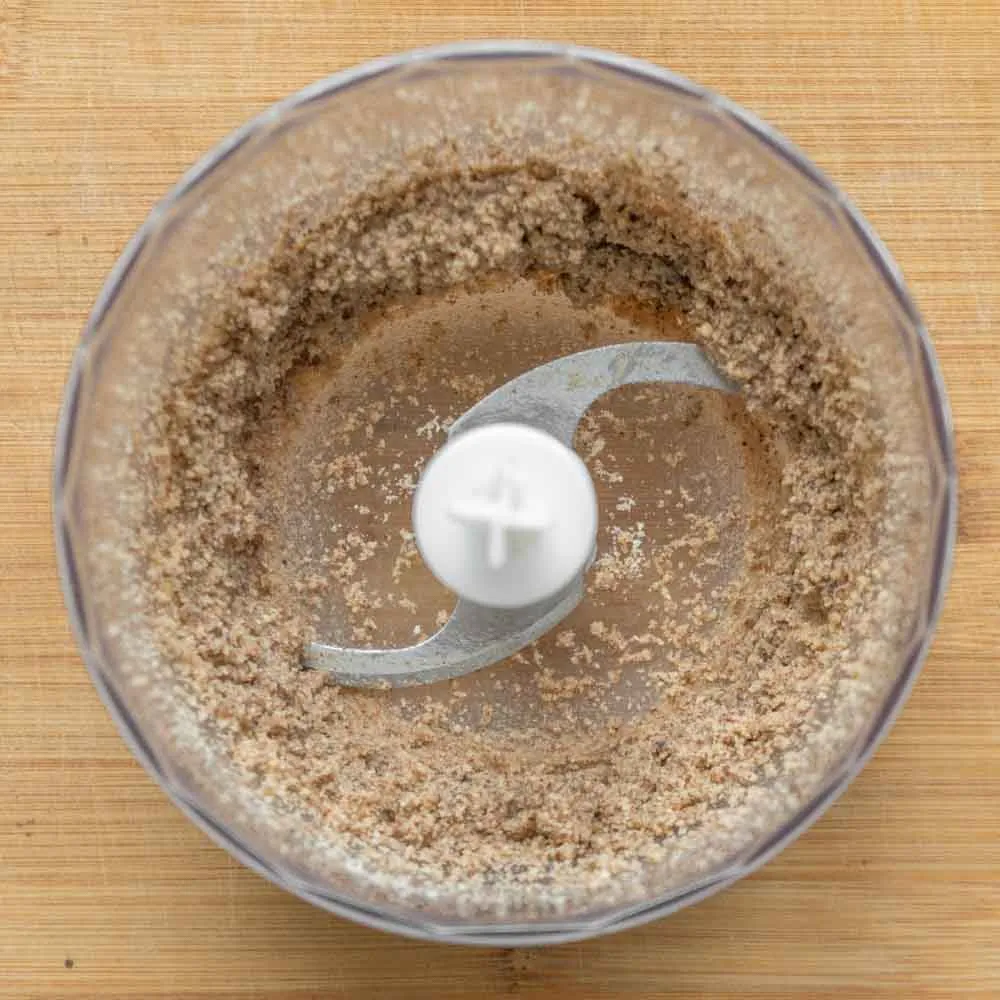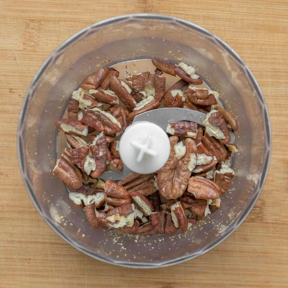 - Измельчаем пеканы (60 гр.) в пасту или мелкую мучку с помощью измельчителя или кофемолки.