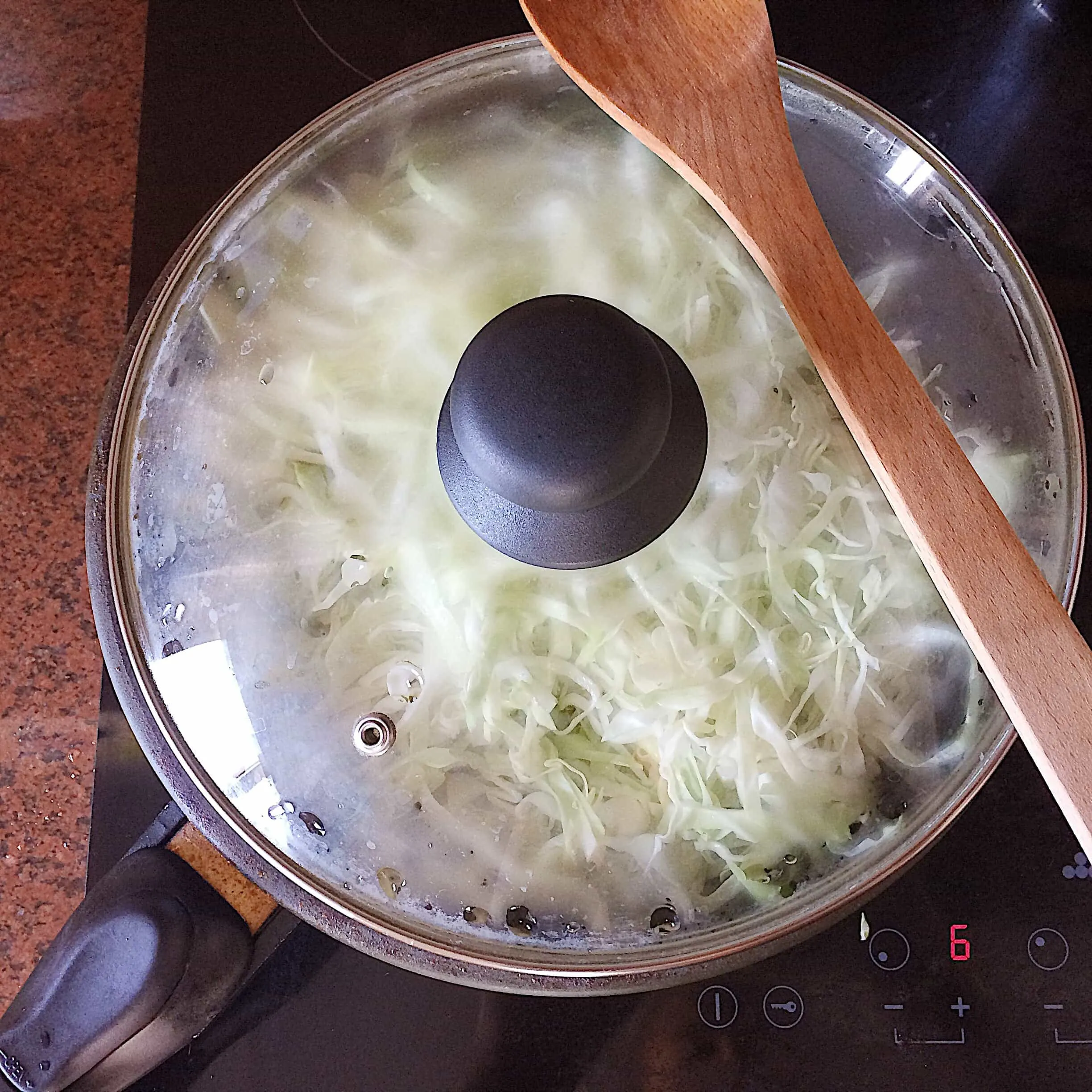 - Снижаем нагрев (6 из 9), добавляем капусту, наливаем чуть-чуть водички, и накрываем крышкой. Тушим минут 5-7 до полуготовности. Здесь важно оставить капусту светлой и слегка хрустящей. Периодически снимайте крышку, перемешивайте, подсаливайте, пробуйте на зуб. Если нужно — долейте еще воды.