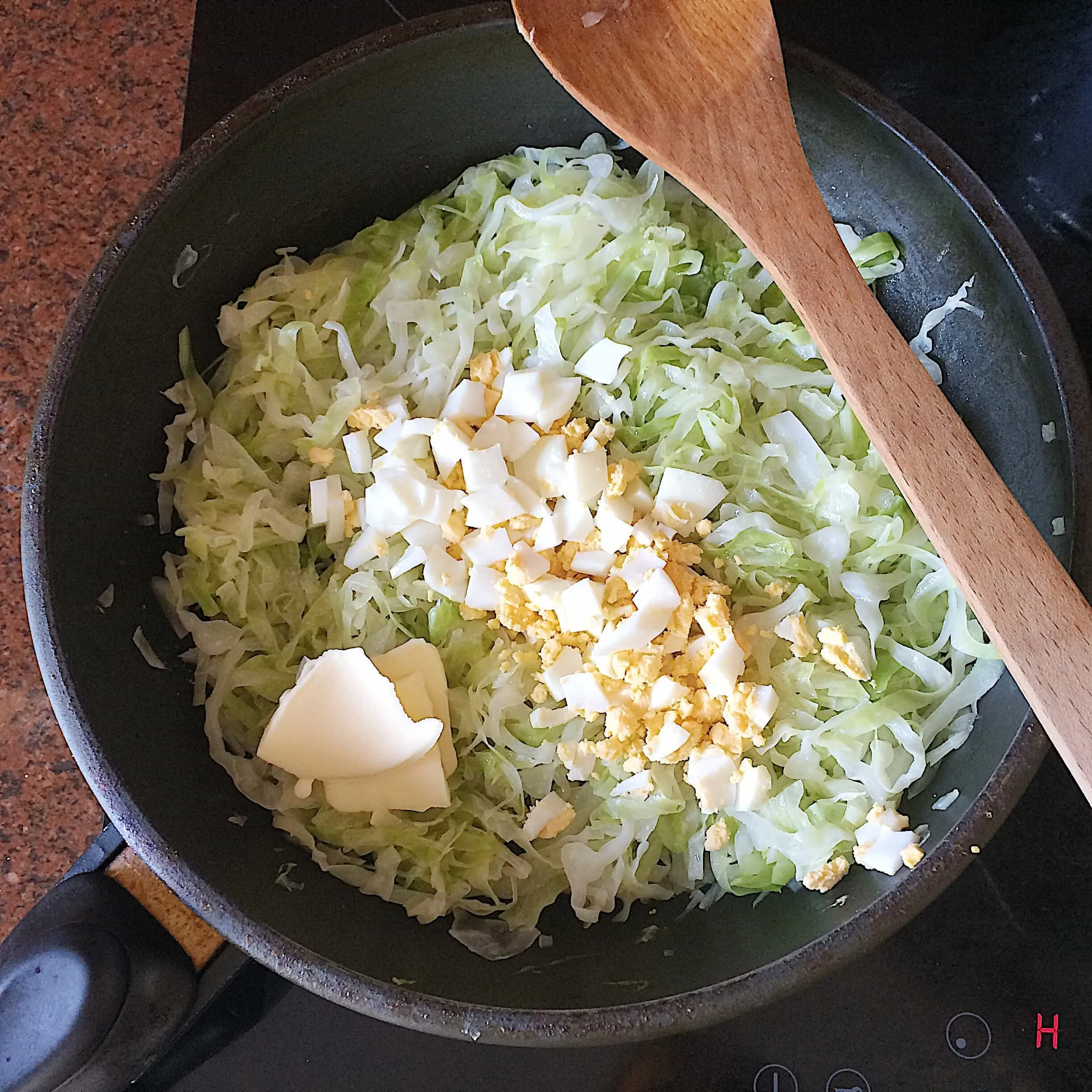 - Как только капуста дошла до нужной кондиции, выключаем нагрев, добавляем ∼0.7 ст.л. слив. масла (слайс 4-5 мм толщины), и яйцо. Если нужно — еще подсолить.