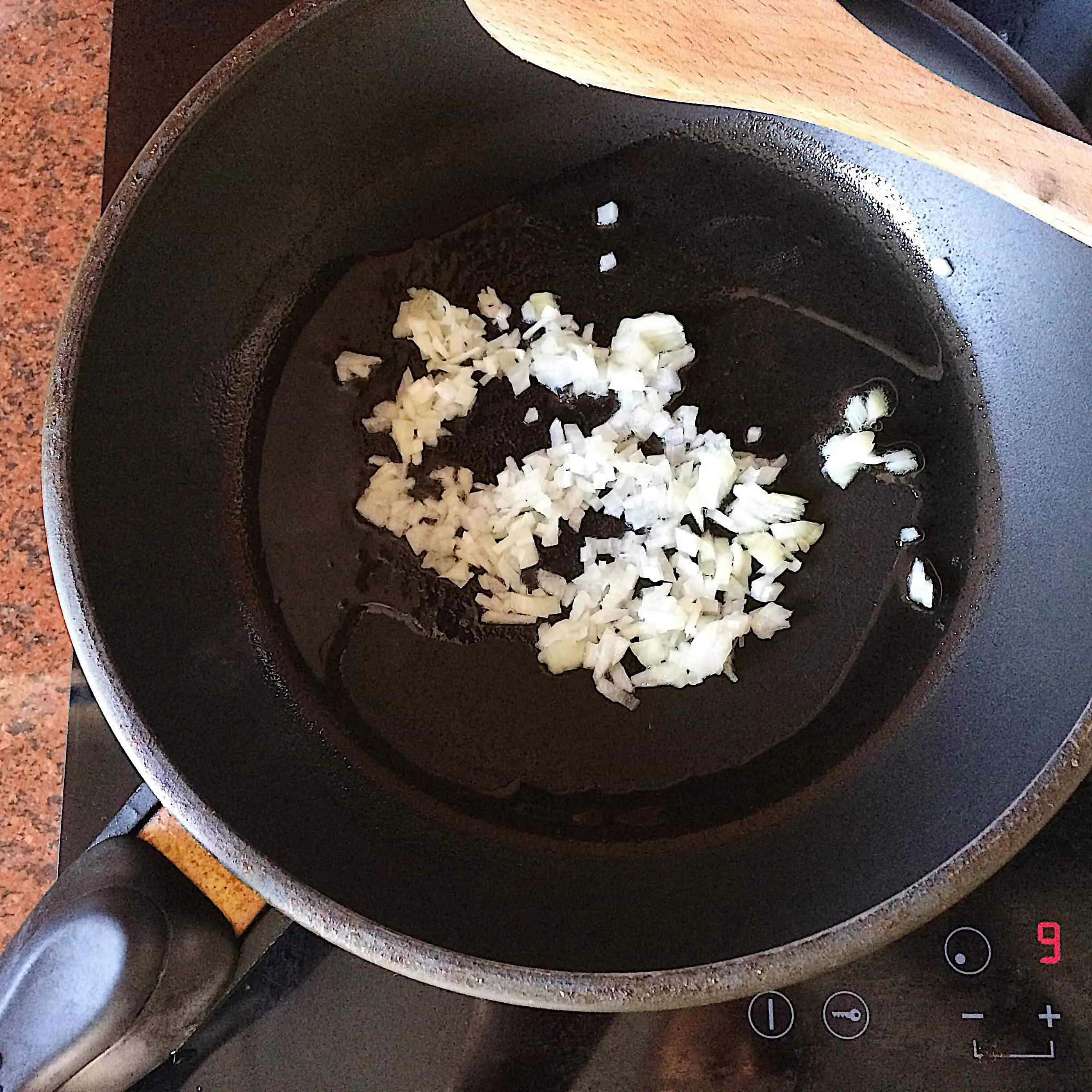 - Разогреваем сковороду, добавляем растительное масло (1 ст.л.), и лук. Обжариваем на большом огне до появления аромата.