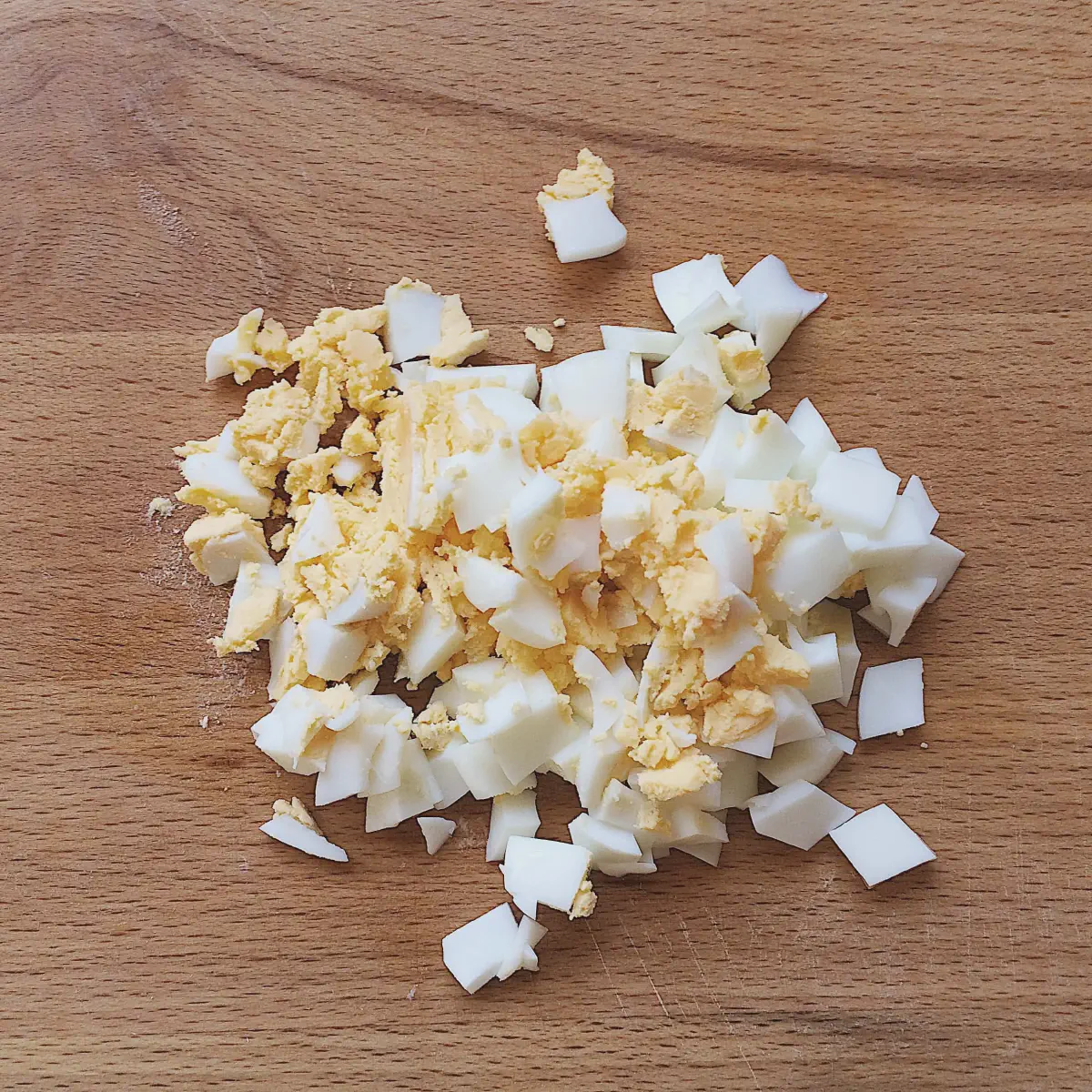В свободное время почистим и порежем яйца кубиками по 0.5-0.7 см.
