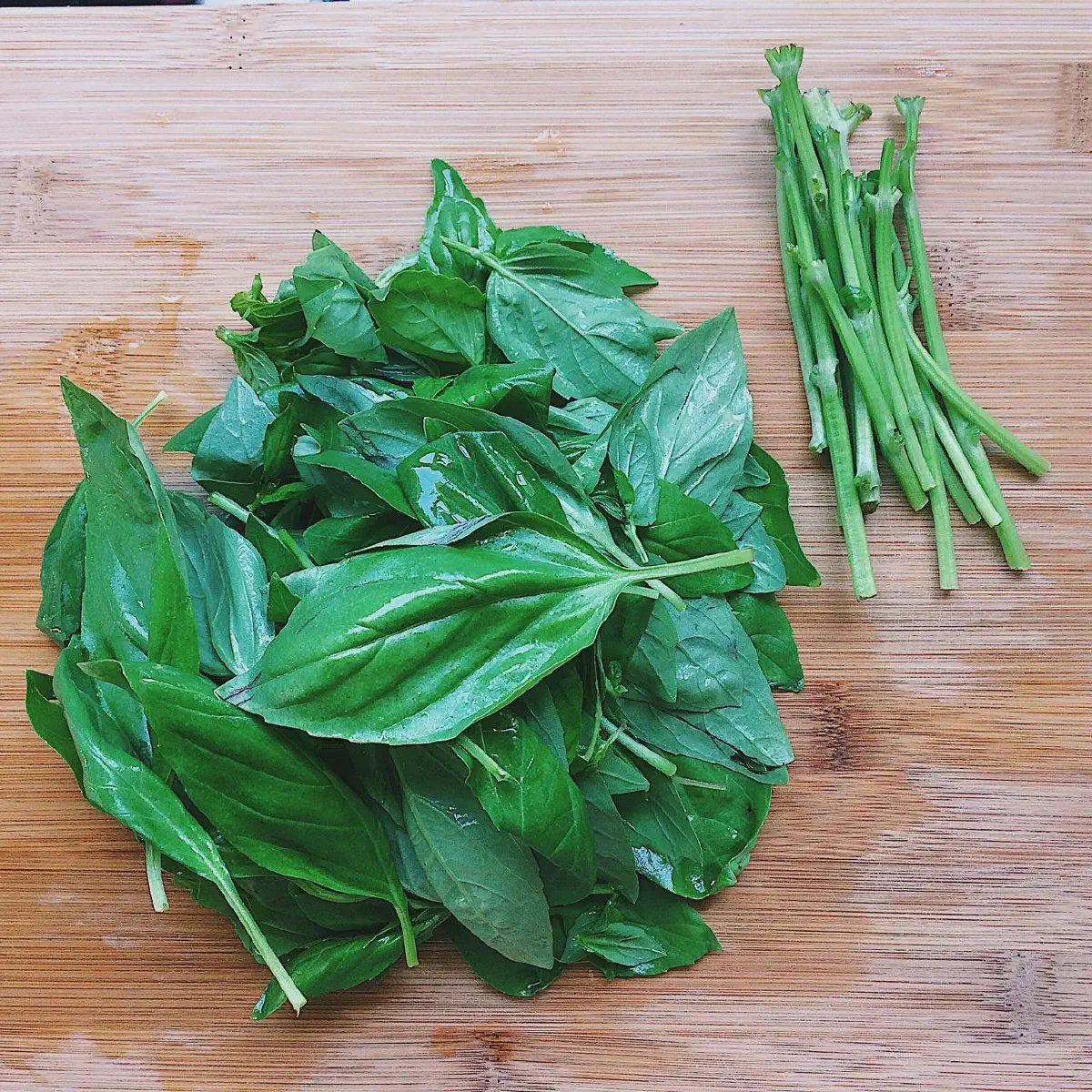 Листья базилика (70 гр) промыть, и отделить от стебля. Маленькие стебельки, которыми листья крепятся к главному стеблю оставляем.