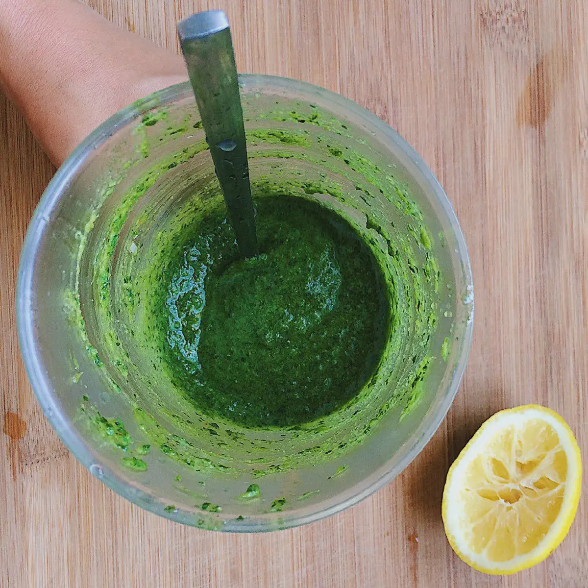 Пробиваем еще- Влить лимонный сок (∼2 ст.л.), и перемешать. Должна получиться однородная пастообразная консистенция. На этом этапе пробуйте соус, и по вкусу добавляйте еще соли или лимонного сока.