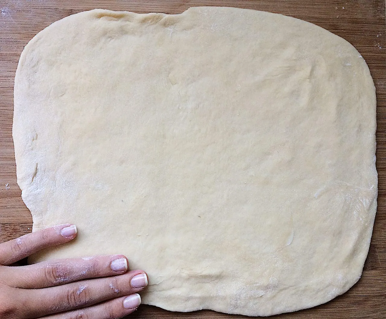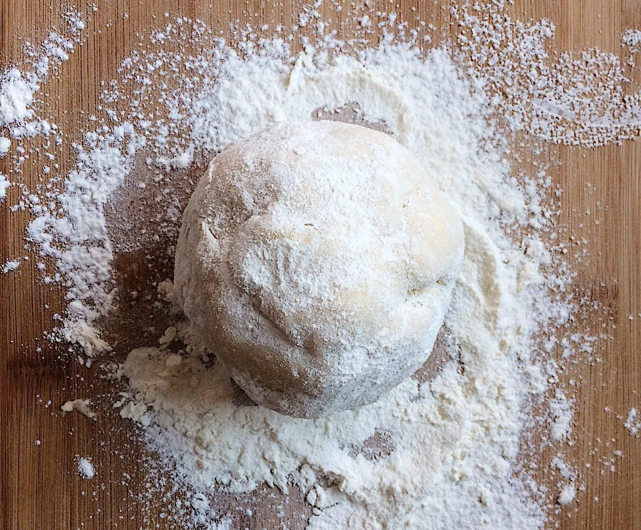 - Отщипываем кусочек холодного теста, обваливаем его в муке со всех сторон, и раскатываем на поверхности без муки. По необходимости — чуть-чуть подпыляем тесто мукой. Дополнительно заморачиваться и охлаждать его для раскатки не нужно — тесто довольно послушное.