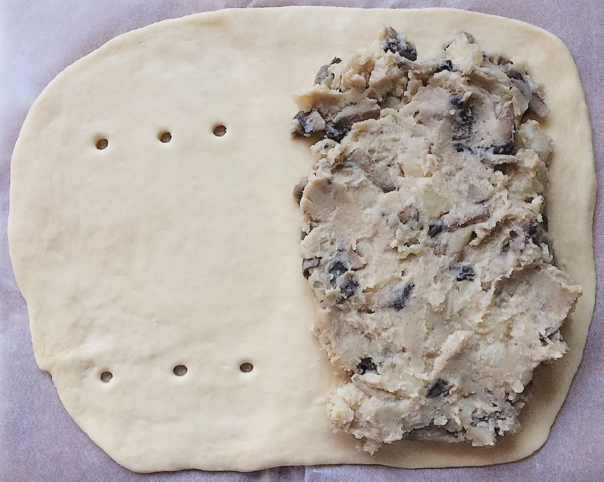 - Для кулебяк я раскатываю слой 2-3 мм, в почти симметричную лепеху. Переношу тесто на бумагу для выпечки (потом это будет сложновато). На одну половину выкладываю начинку, вторую дырявлю с помощью насадки для крема.