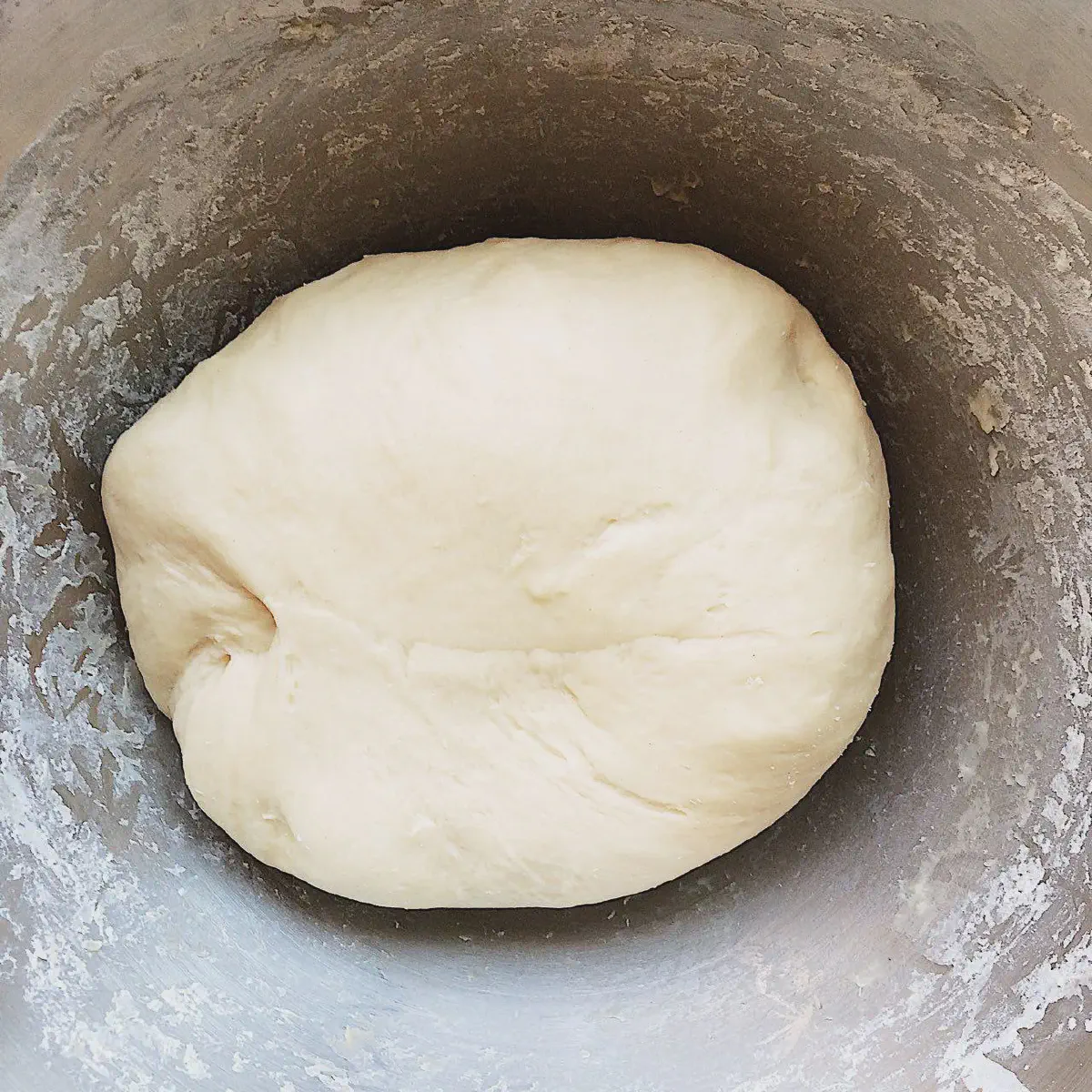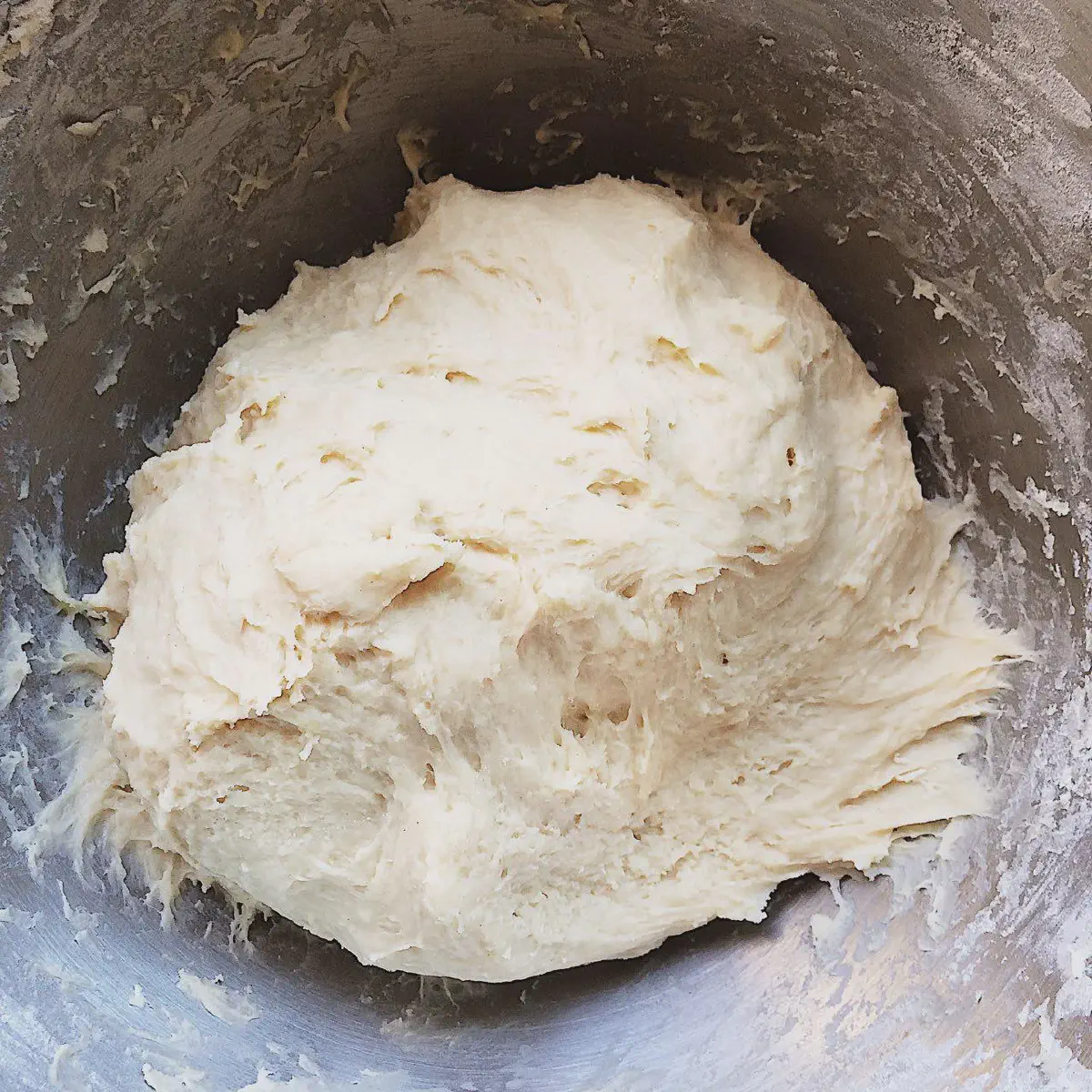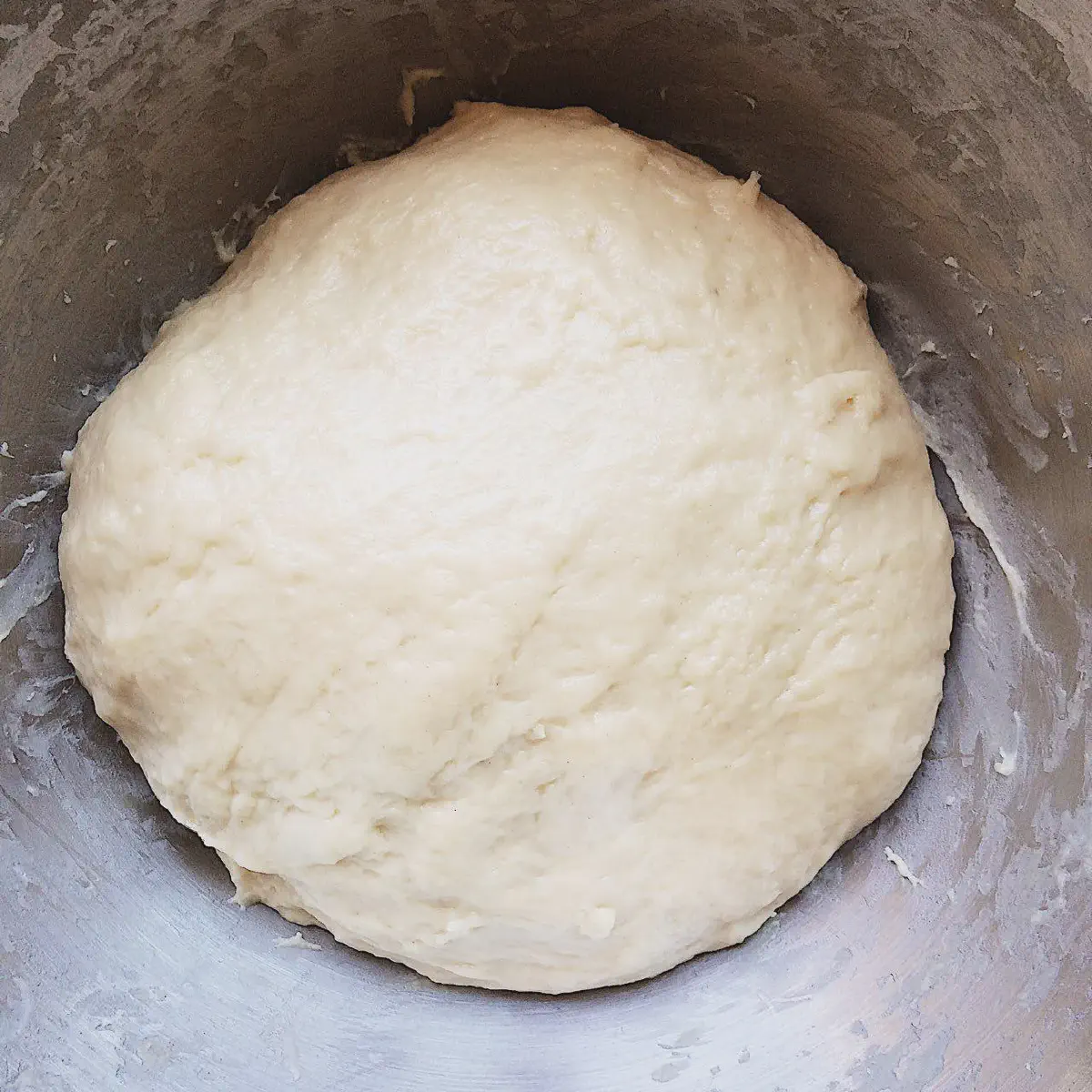 - Вручную месим еще минут 15, пока тесто не станет гладким и эластичным. Миксером на это уходит ∼10 минут на средней скорости. Муки НЕ добавляем. За счет долгого вымешивания, в тесте развивается глютен — оно перестает липнуть, и получается эластичным и прочным.