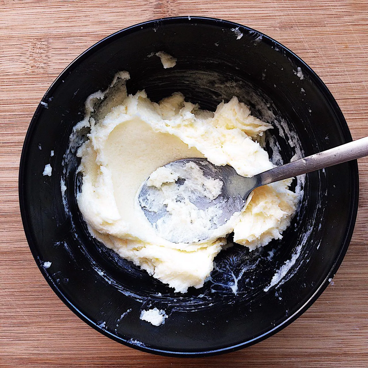 - Масло уже должно подтаять — смешиваем его с сахаром до состояния мягкой пасты. Просто ложкой.