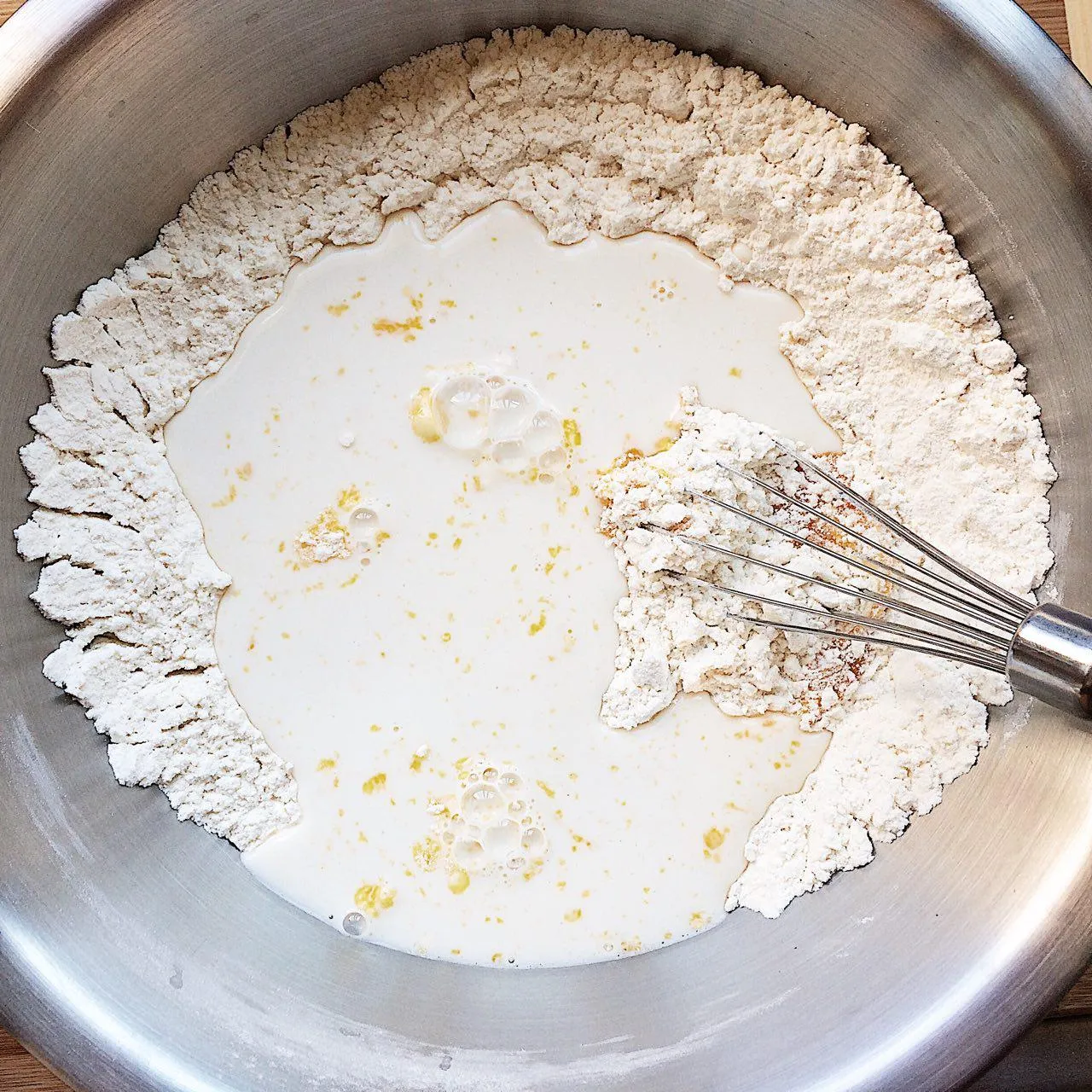 - Добавляем желтки (3 шт) и вливаем молоко с дрожжами. Венчик нам больше не понадобится — вытащите его заранее, чтобы меньше мыть.