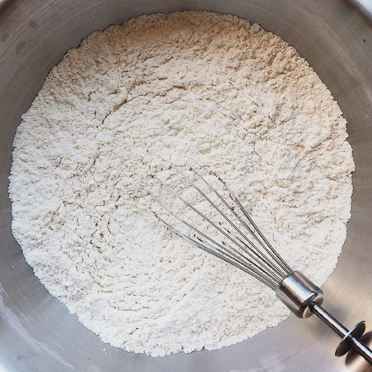 Хорошенько размешиваем- В глубокую миску просеиваете муку (450 гр), добавляете соль (10 гр, 2 ч.л.) и хорошенько смешиваете венчиком, чтобы соль распределилась по всему объему муки.
