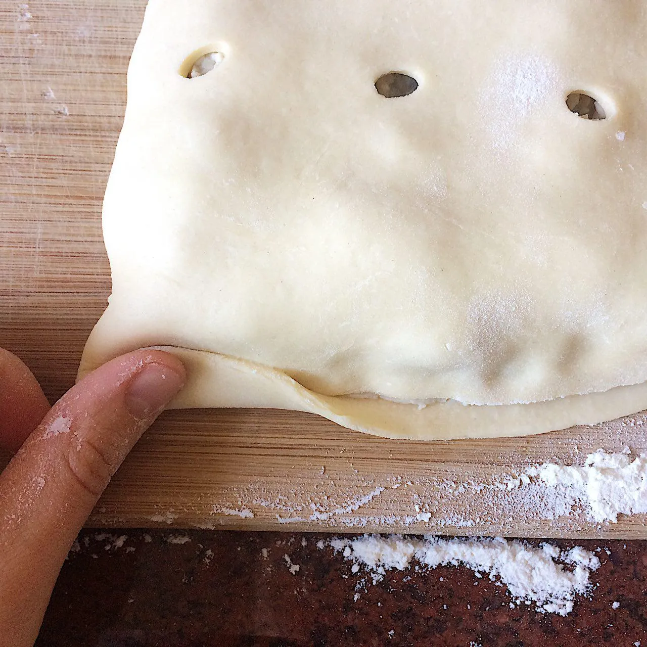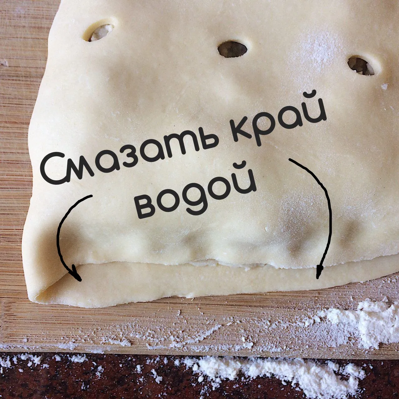 Чуть-чуть смазываю свободный край теста у начинки водичкой, закрываю кулебяку как книжку, и закрываю внахлест. Можно завернуть жгутиком, но рисунок не особо будет виден.