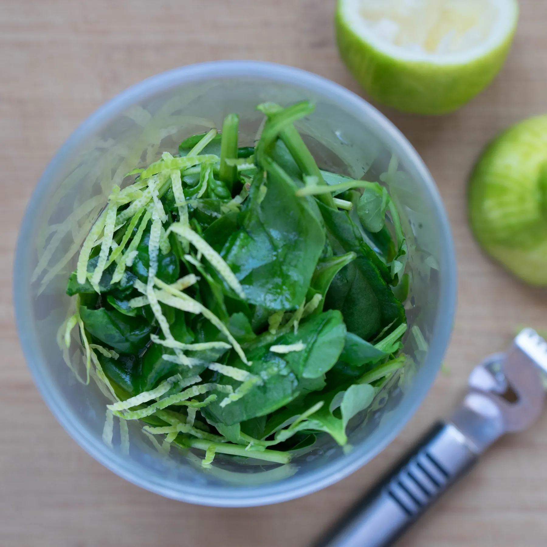 Шпинат (200гр.) помыть, перебрать, отщипнуть толстые стебли, если есть, хорошенько отряхнуть от воды, выложить в чашу блендера. Добавить растительное масло (160 гр.), цедру одного лимона, и лимонный сок (2 ст.л., 30 гр.). Количество цедры варьируйте по своему вкусу, но полностью не убирайте — она дает интересный вкус и аромат в этом рецепте. Хорошенько измельчаем блендером до однородной массы. Полностью однородной массы.