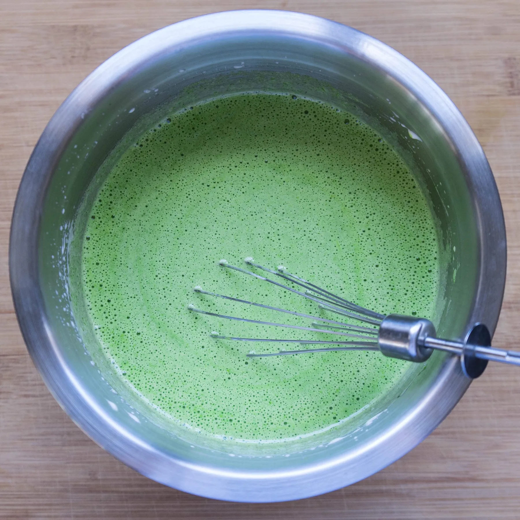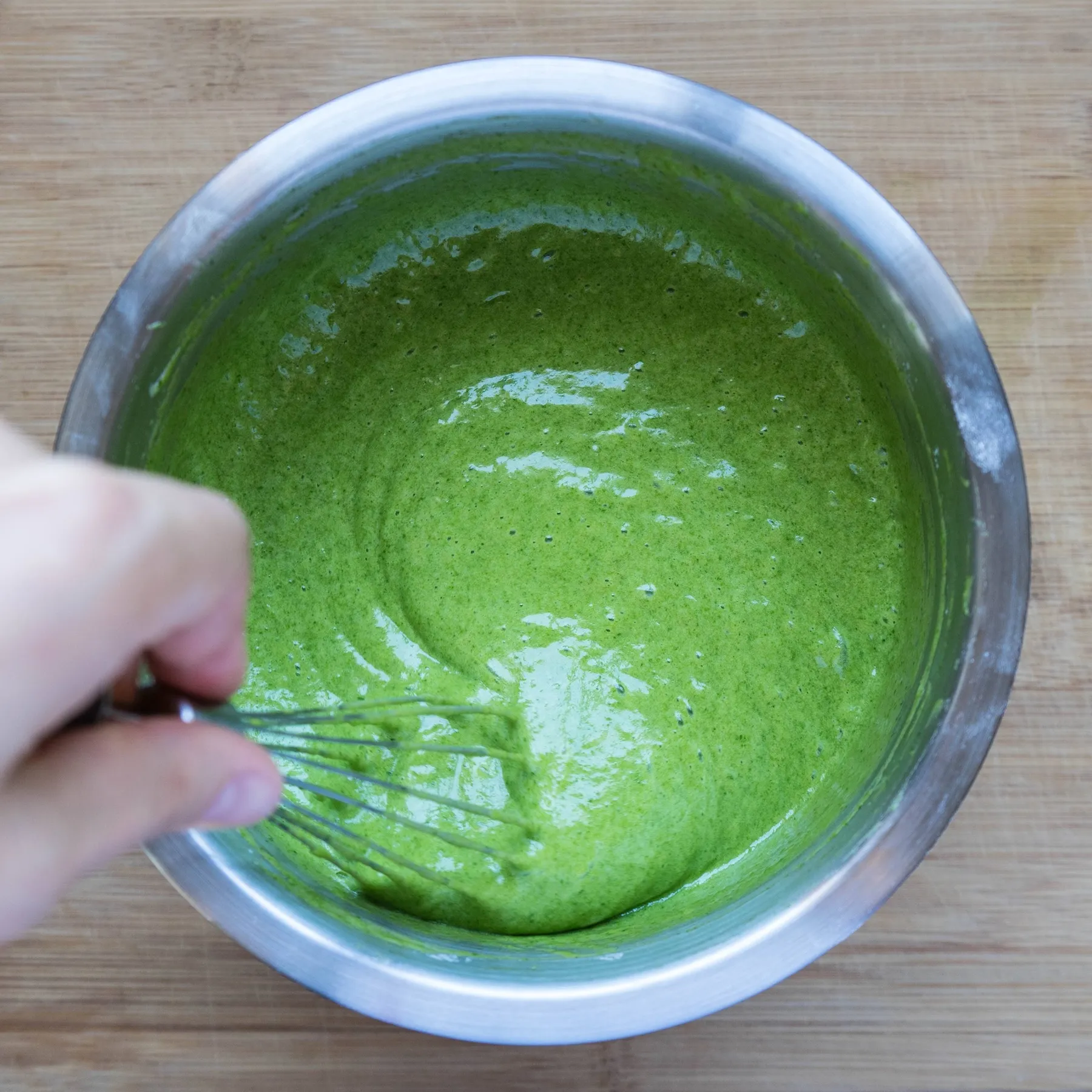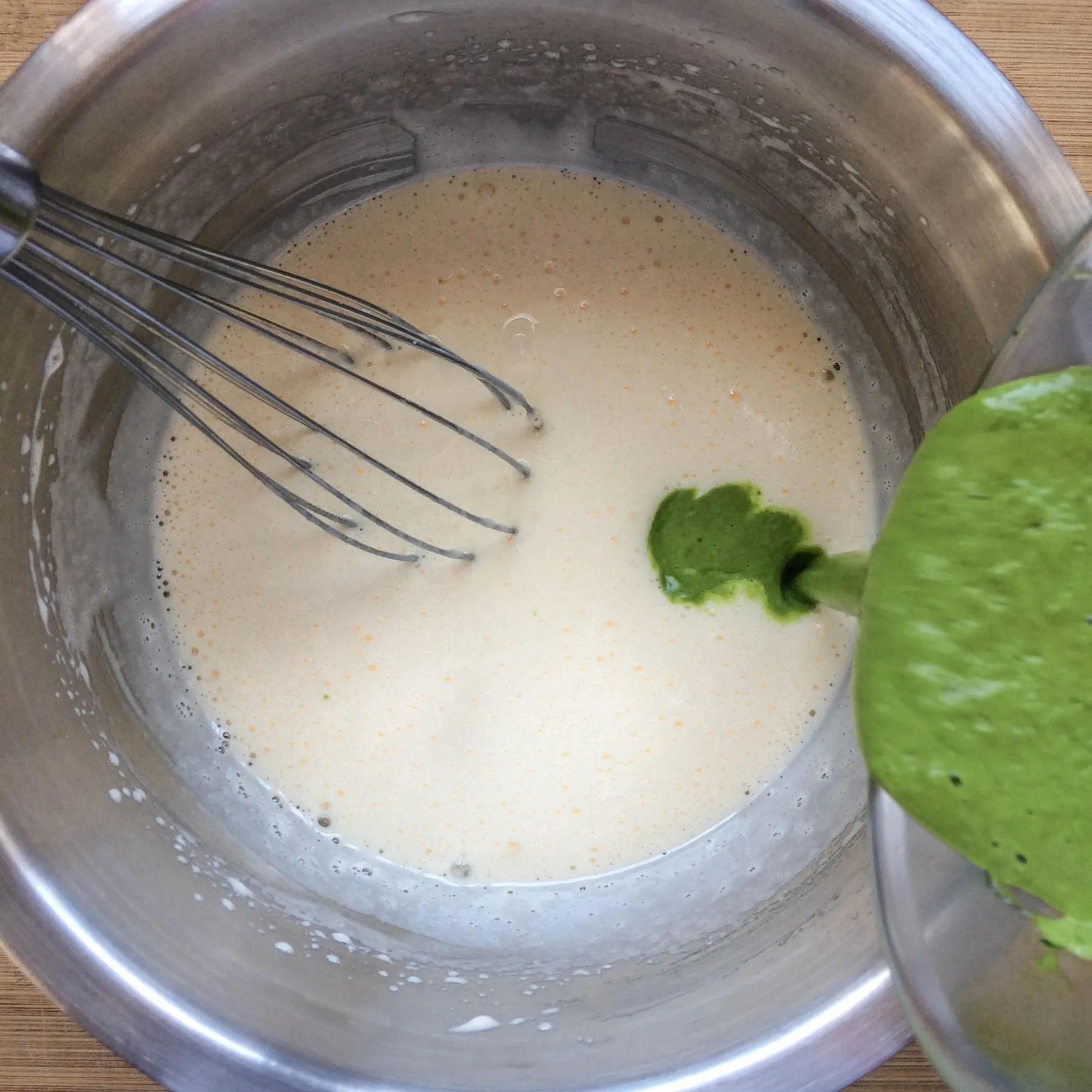 - Аккуратно, вручную мешая венчиком, вводим шпинатную смесь (или на малой-малой скорости миксера, если он умеет. Если нет — вручную).