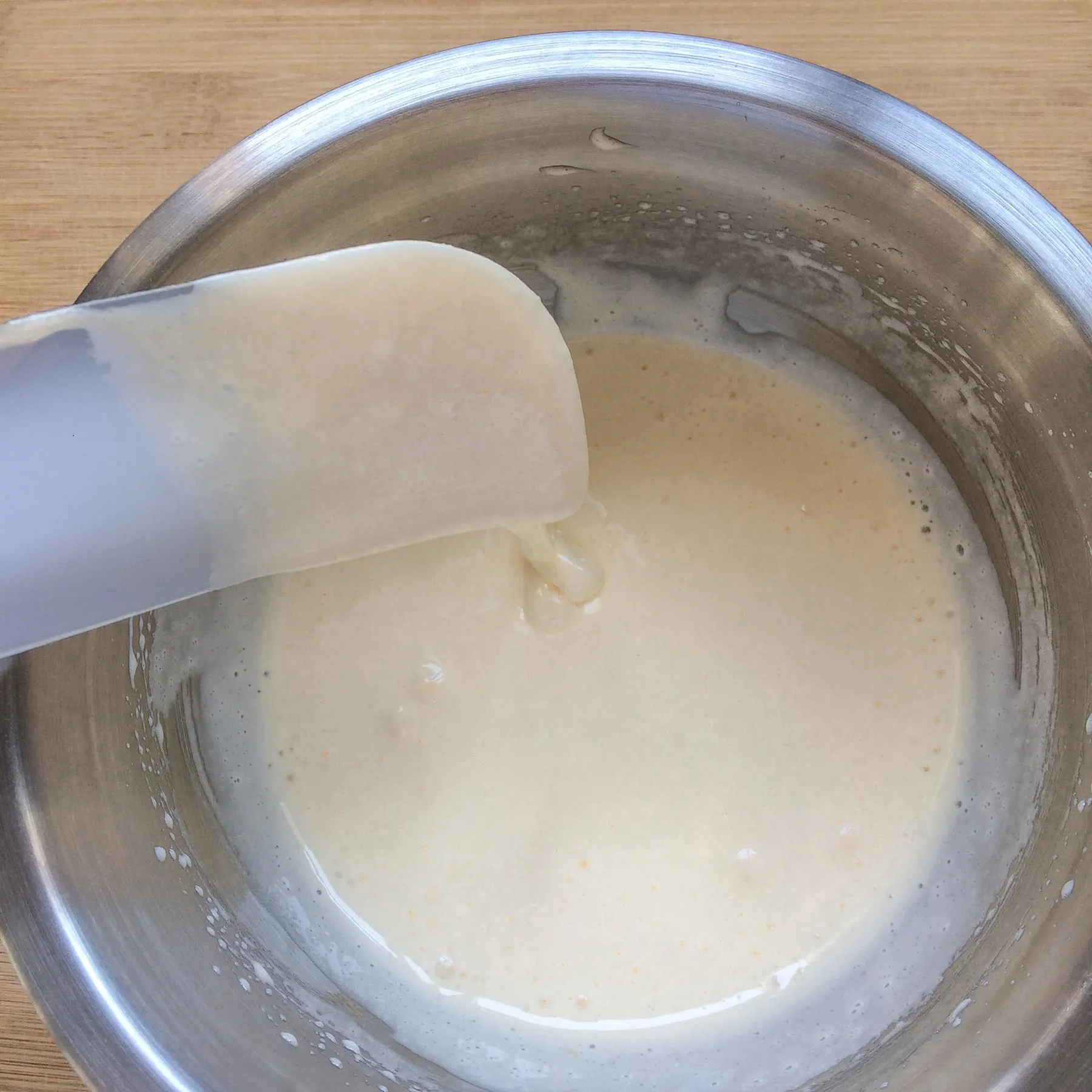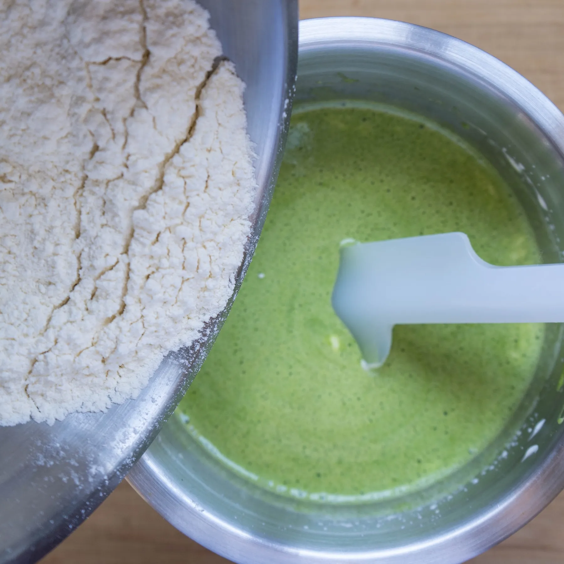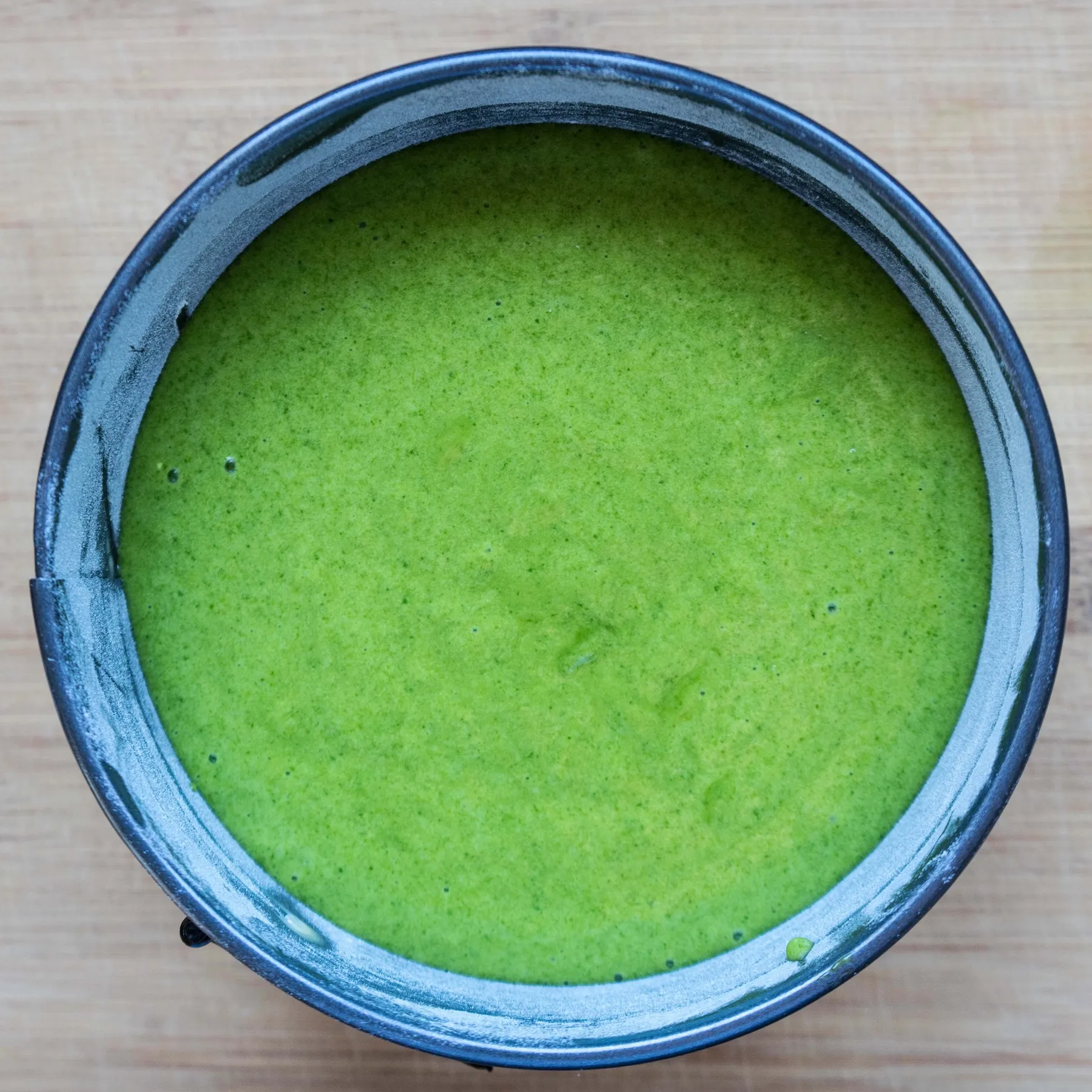 - Аккуратно, вручную мешая венчиком, вводим шпинатную смесь (или на малой-малой скорости миксера, если он умеет. Если нет — вручную).