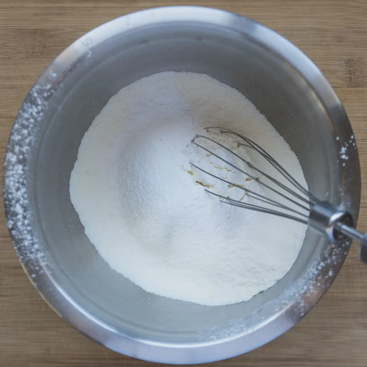 - В миску просеиваем муку (200 гр.), разрыхлитель (11 гр.), и ванилин, если используете. Хорошенько смешиваем венчиком до однородности, чтобы в тесте не было скоплений разрыхлителя, и оно поднялось равномерно.