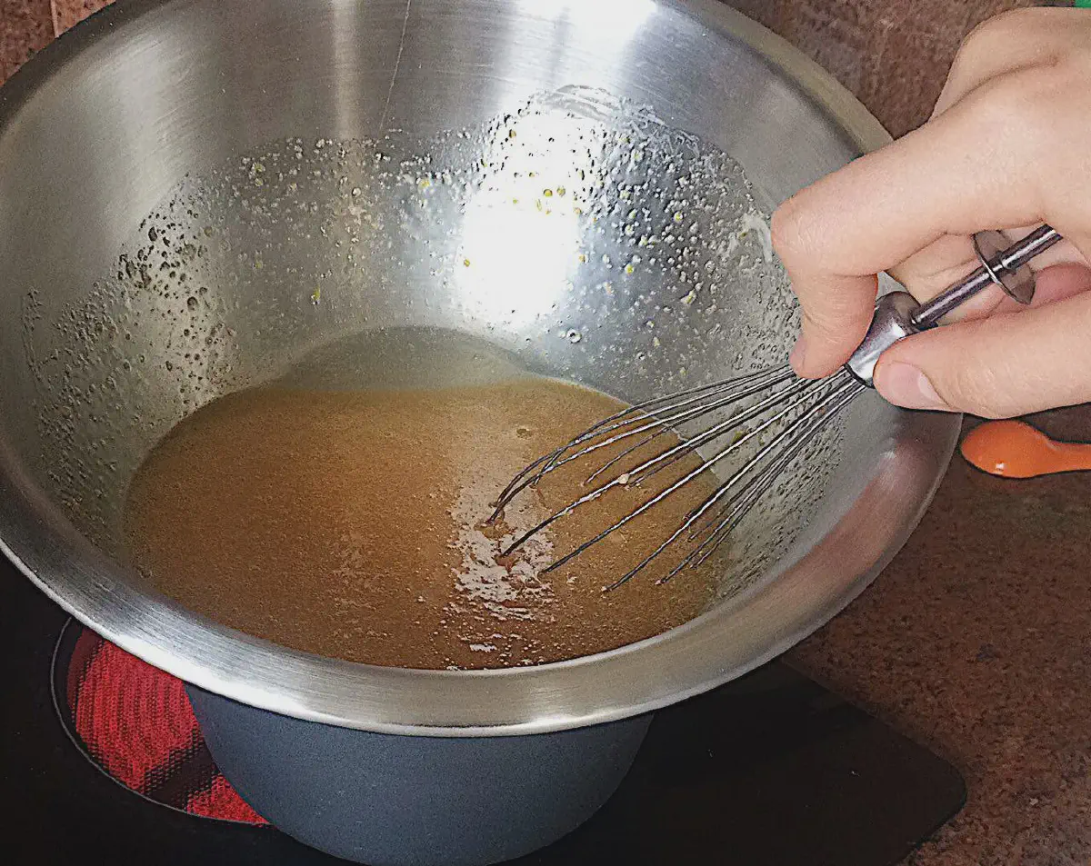 - Ставим масляную смесь на водяную баню — в кастрюлю или сотейник наливаем 2 см. воды, и включаем максимальный нагрев — так она быстрее закипит, а объема воды хватит, чтобы нагреть массу. Смотрите, чтобы миска плотно стояла на кастрюльке — не надо держать ее — можете обжечься паром.
