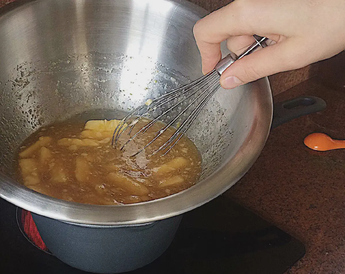 - При постоянном помешивании, доводим смесь до однородности. Мешаем постоянно, чтобы тепло распределялось равномерно, и яйца не сворачивались на донышке.
