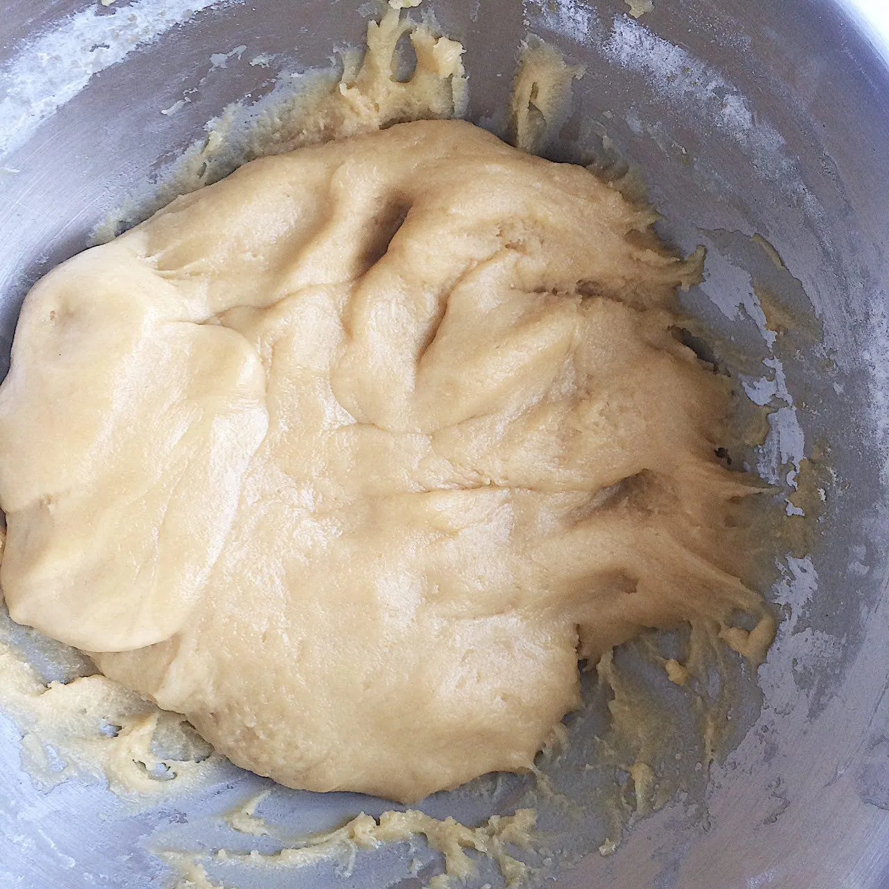 Как только тесто остынет до температуры ∼40°С, оно должно перестать липнуть к рукам (если месили вручную — смойте прилипшее тесто, чтобы это проверить, иначе оно так и будет прилипать). Если все равно липнет — добавьте немного муки, или поставьте в холодильник на час, если есть время.