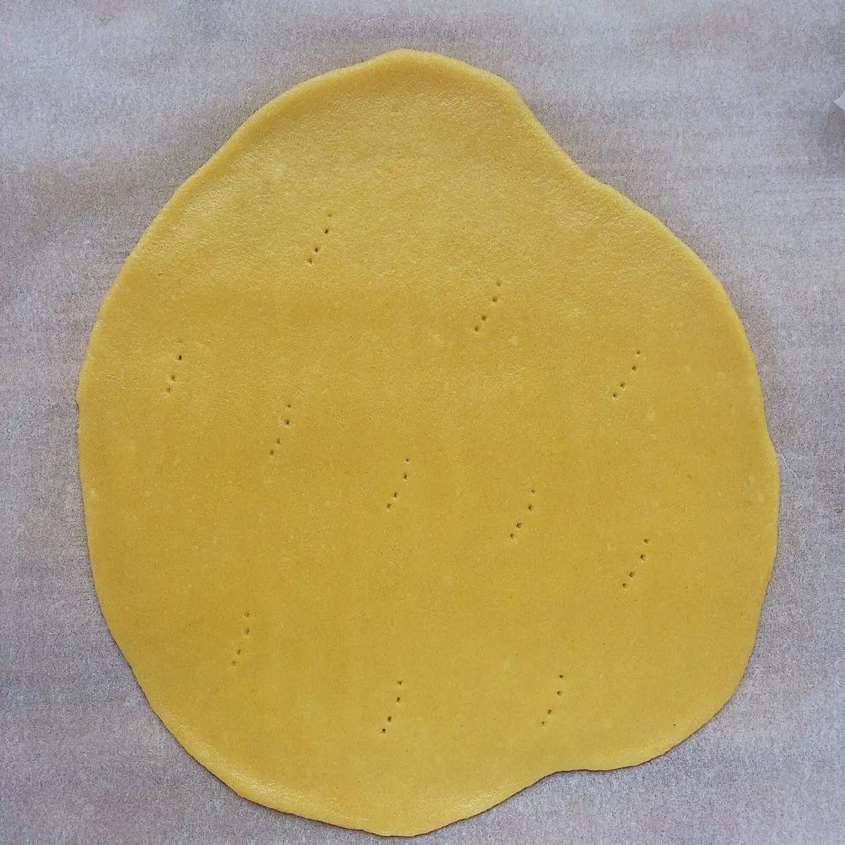 Накалываем вилочкой — при раскатке, под тестом все равно образуются небольшие полости воздуха — при выпечке пар и углекислый газ будут их раздувать, и сам корж поднимется горбом. Чтобы этого не было — накалываем вилочкой)