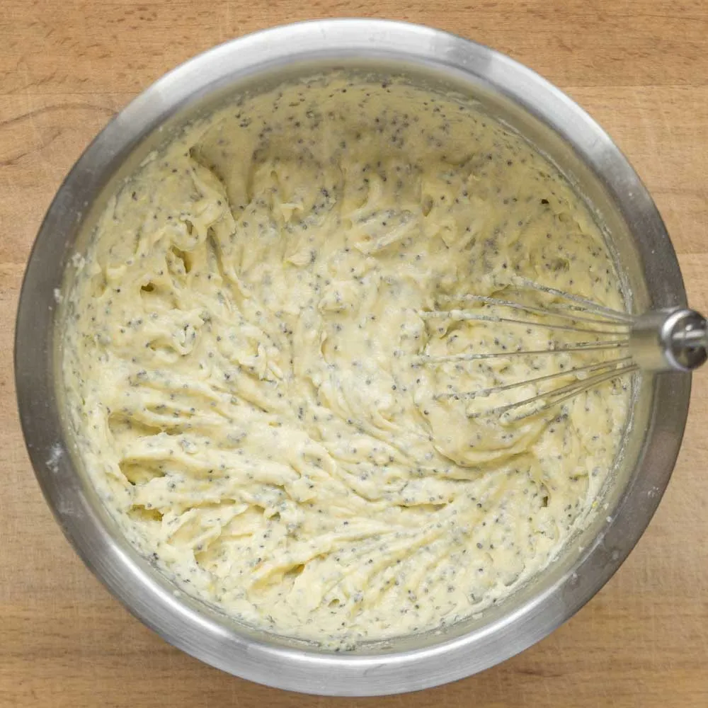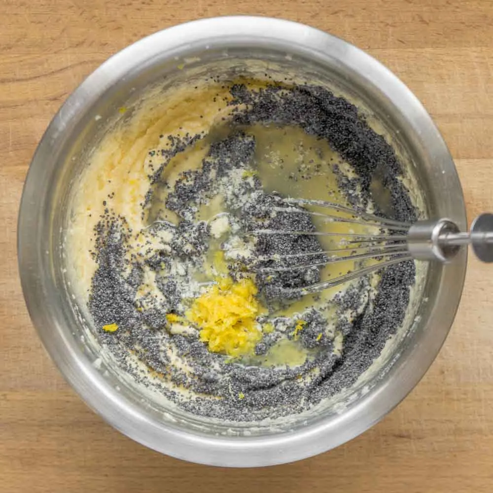 После яиц — мак (2 ст.л.), цедру 1 лимона (∼2 ч.л.), сок лимона (30 гр.), и ванильный экстракт, если используешь его.