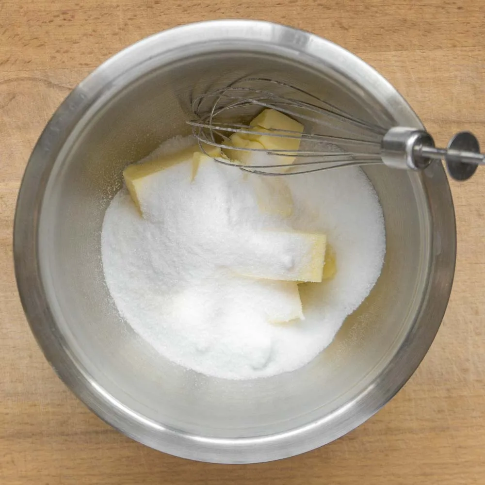 В другой миске соединяем мягкое сливочное масло (115 гр) и сахар (100 гр.). Взбиваем до мягкости и однородности.
