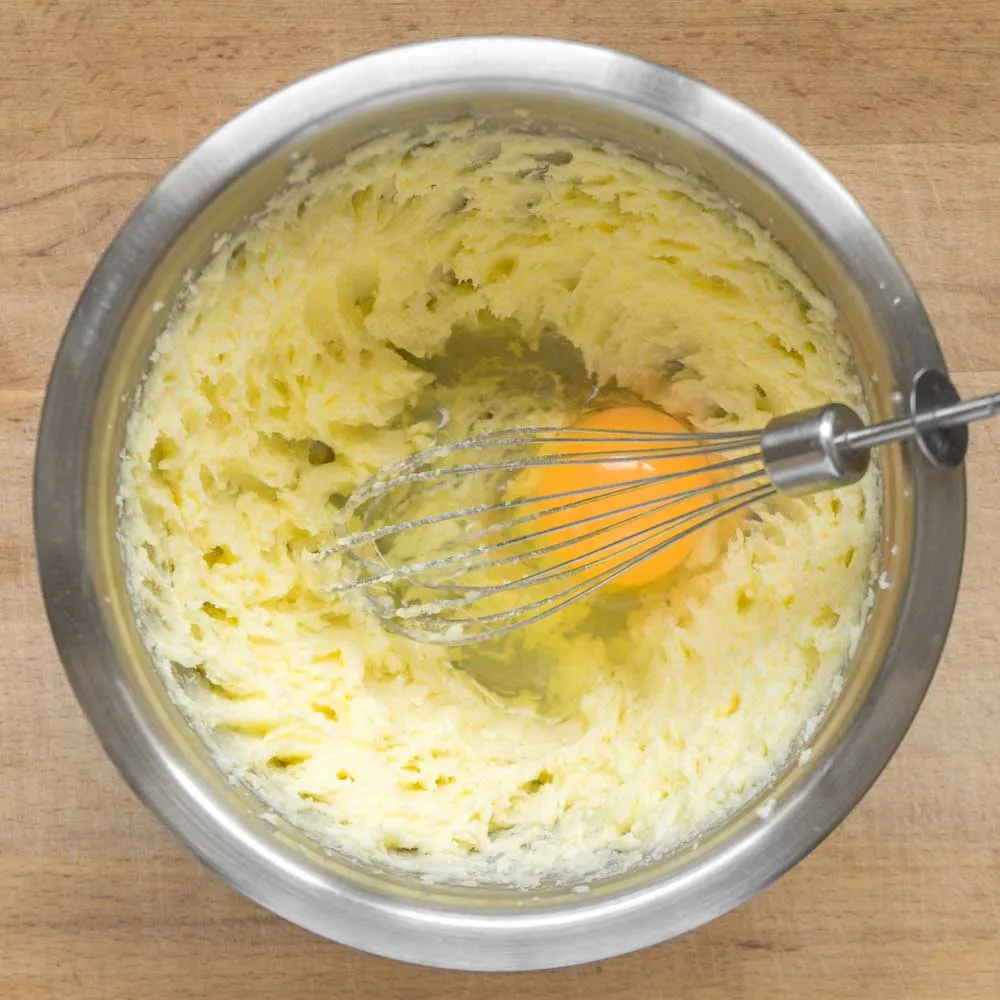 - В масляную смесь по одному вводим яйца (2 шт), после этого каждый раз тщательно взбивая до однородности. Если яйца холодные, то смесь может расслоиться. Если это произошло — можешь или чуть-чуть подогреть ее, и продолжить взбивать, или добавить чуть-чуть муки (из смеси для рецепта).