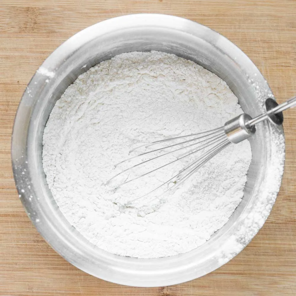 В отдельной миске просеиваем муку (150 гр.), разрыхлитель (0.5 ч.л.), и ванилин, если используете его, а не экстракт. Хорошенько размешиваем венчиком.