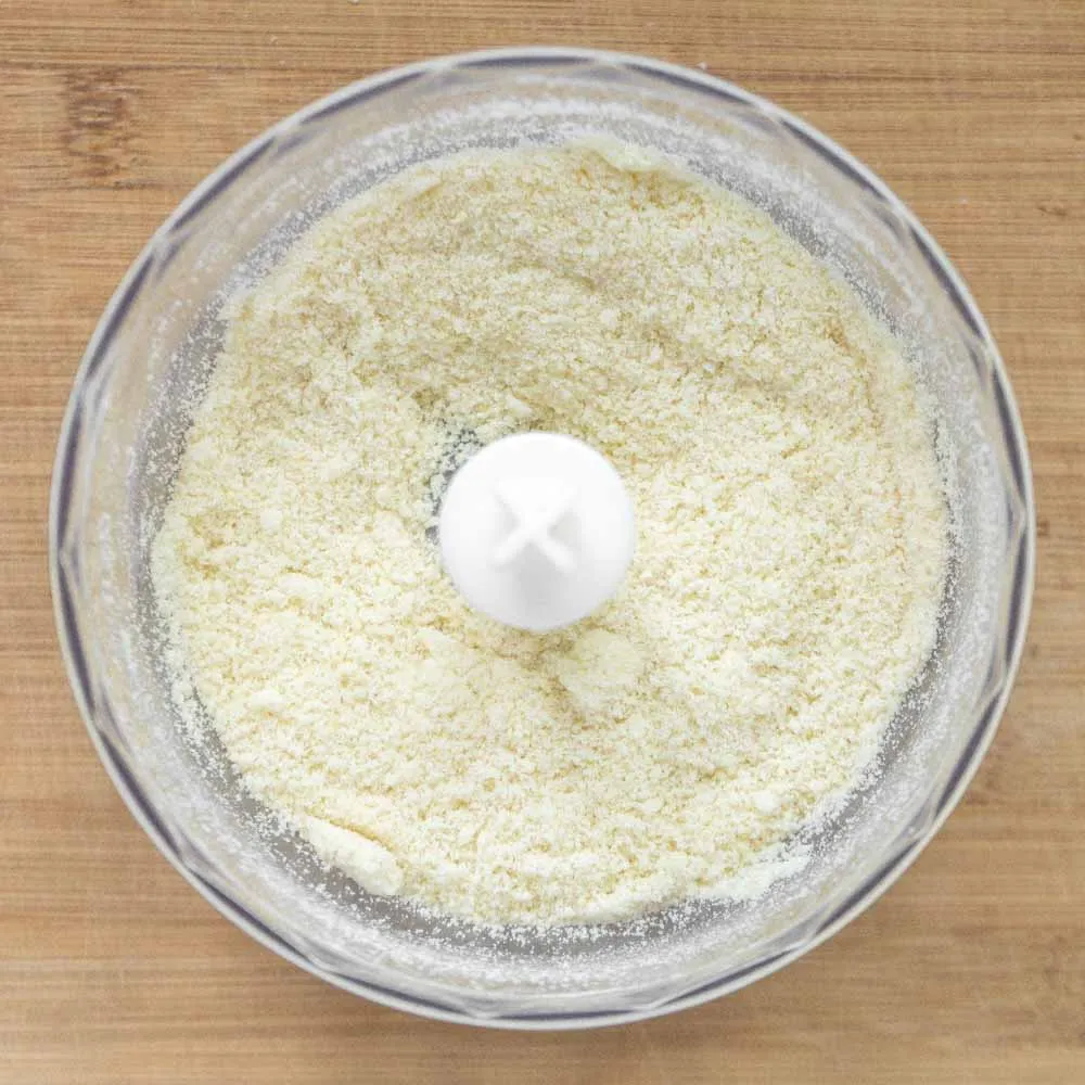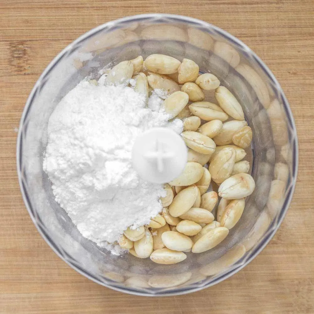 - Чищеный миндаль (125 гр.) соединяем с сахарной пудрой (65 гр.) в измельчителе, и доводим его до мелкой-мелкой крошки. Чем мельче помол, тем однороднее будет марципан.