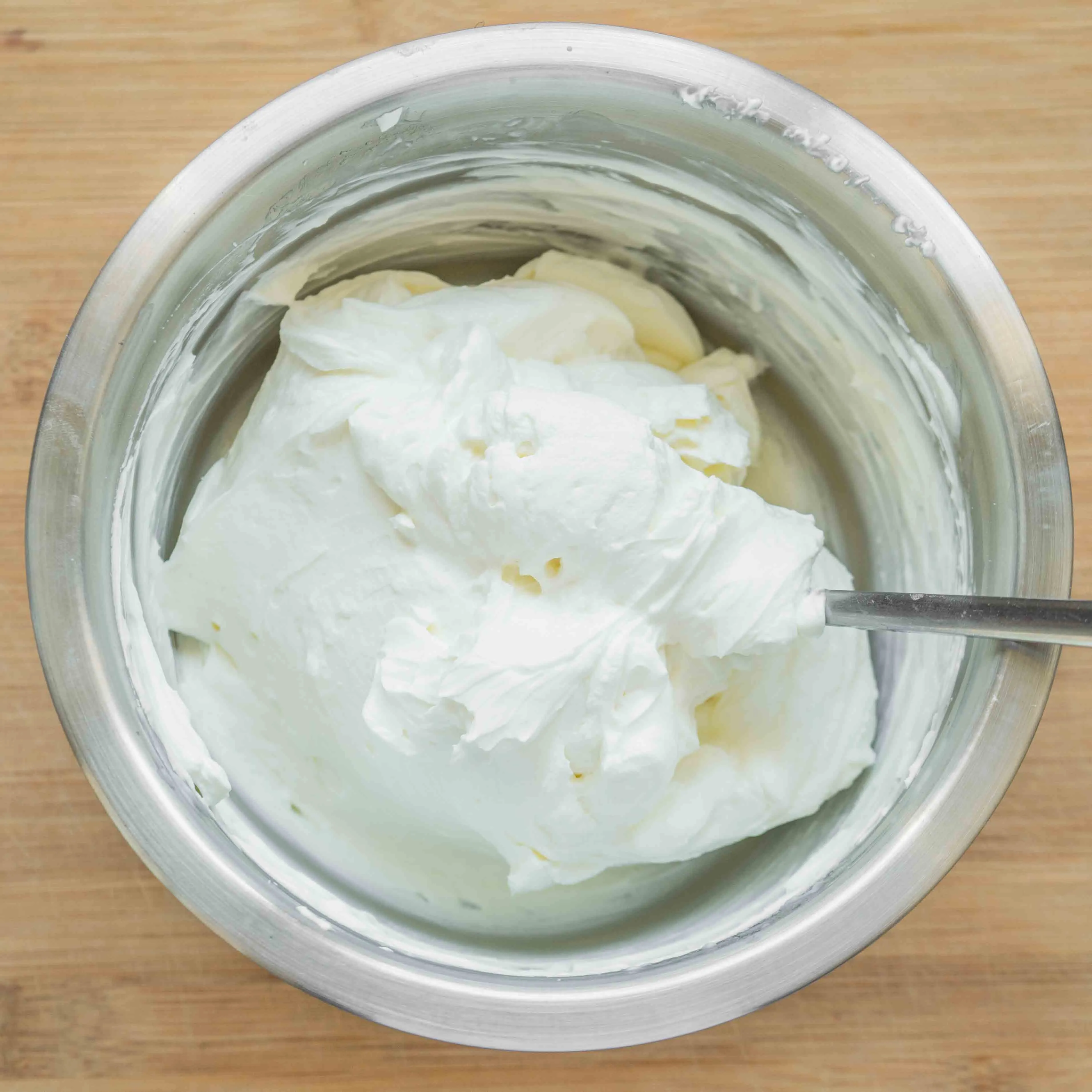 - Для крема смешиваем все ингредиенты — сливочный сыр (200гр), сливки 33% (60гр), сахарную пудру (40гр) и ванильный экстракт в одной миске, и взбиваем до устойчивого состояния.