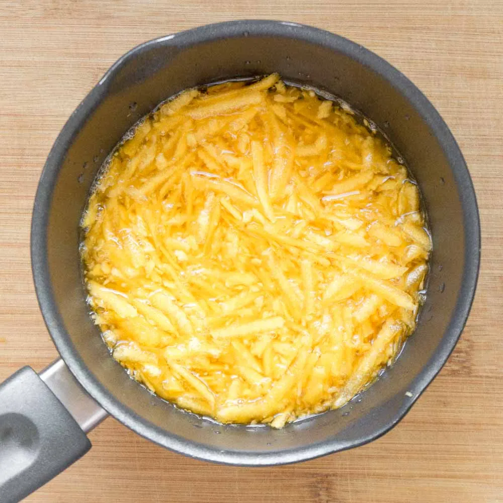 Для этого чистим тыкву, натираем на крупной терке — для рецепта нужно 160гр. мякоти. Перекладываем в ковшичек, заливаем водой, чтобы она только-только покрыла всю тыкву. Добавляем небольшую щепотку соли, перемешиваем, и ставим на сильный огонь.