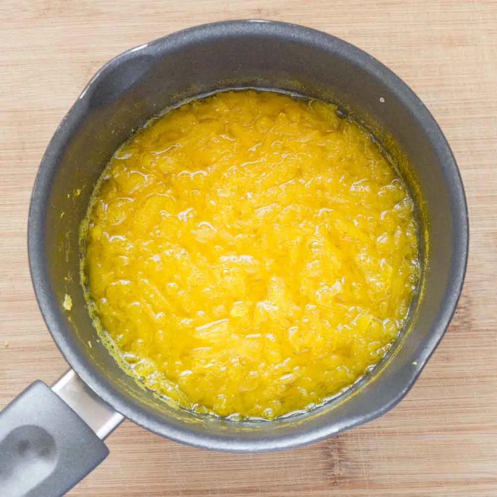 Если есть термометр, то нам нужно довести ее до температуры 70-75°С. Если термометра нет — ждем, когда она только-только начнет булькать, держим секунд 10, и снимаем. Постоянно помешиваем, нагрев не повышаем.