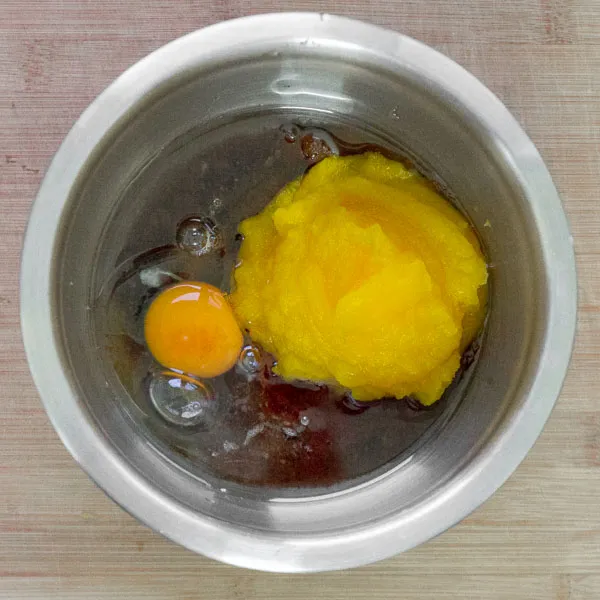 В другой миске соединяем тыквенное пюре (160гр.), коричневый сахар (180гр.), растительное масло (120гр.) и яйцо (1шт), взбиваем миксером до однородности.