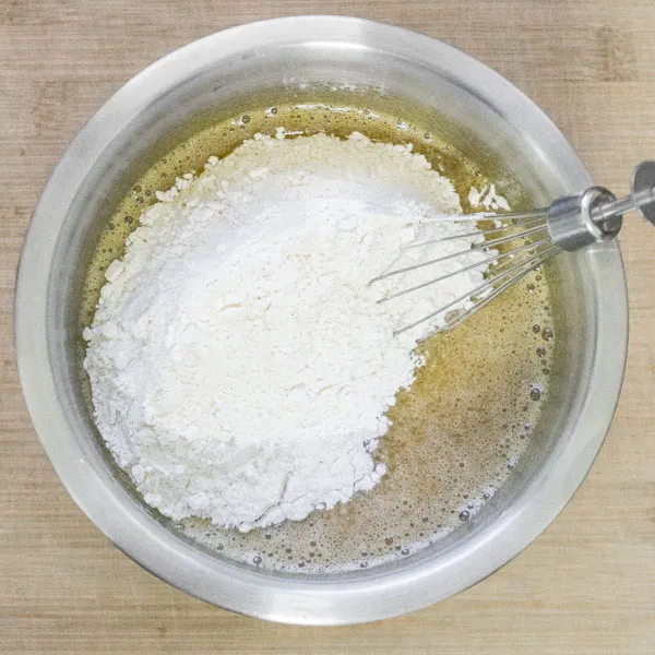 - Как только жидкие ингредиенты соединились — высыпаем в них сухие, и хорошенько взбиваем 5-7 минут. Это важно — здесь мы насыщаем тесто кислородом, за счет чего оно будет пышнее и нежнее.