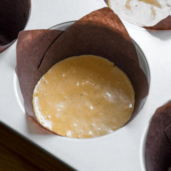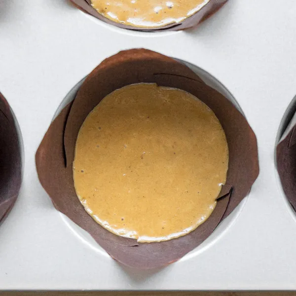 - Заливаем тесто по формам, выстеленным бумажными формочками или бумагой для выпечки примерно на 2/3 от высоты — оно хорошо поднимается.