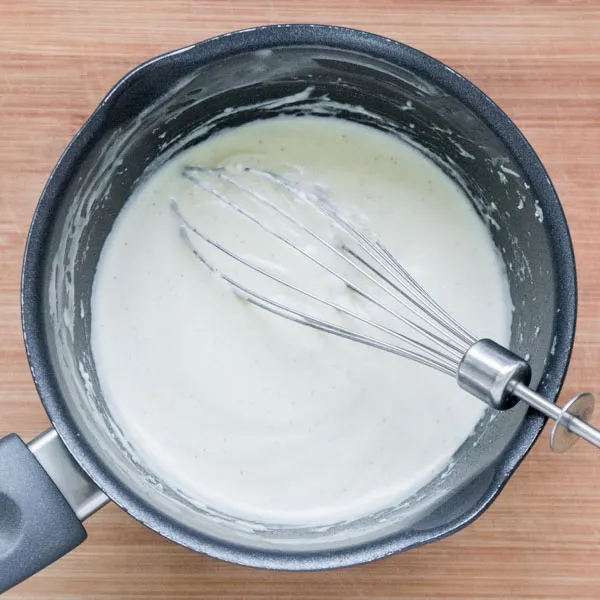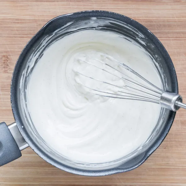 В ковшичке соединяем сливочный сыр (200гр), сахар (20гр), желток (1шт), сливки (60гр), и ванильный экстракт. Размешиваем венчиком и ставим на средний нагрев (5 из 9).